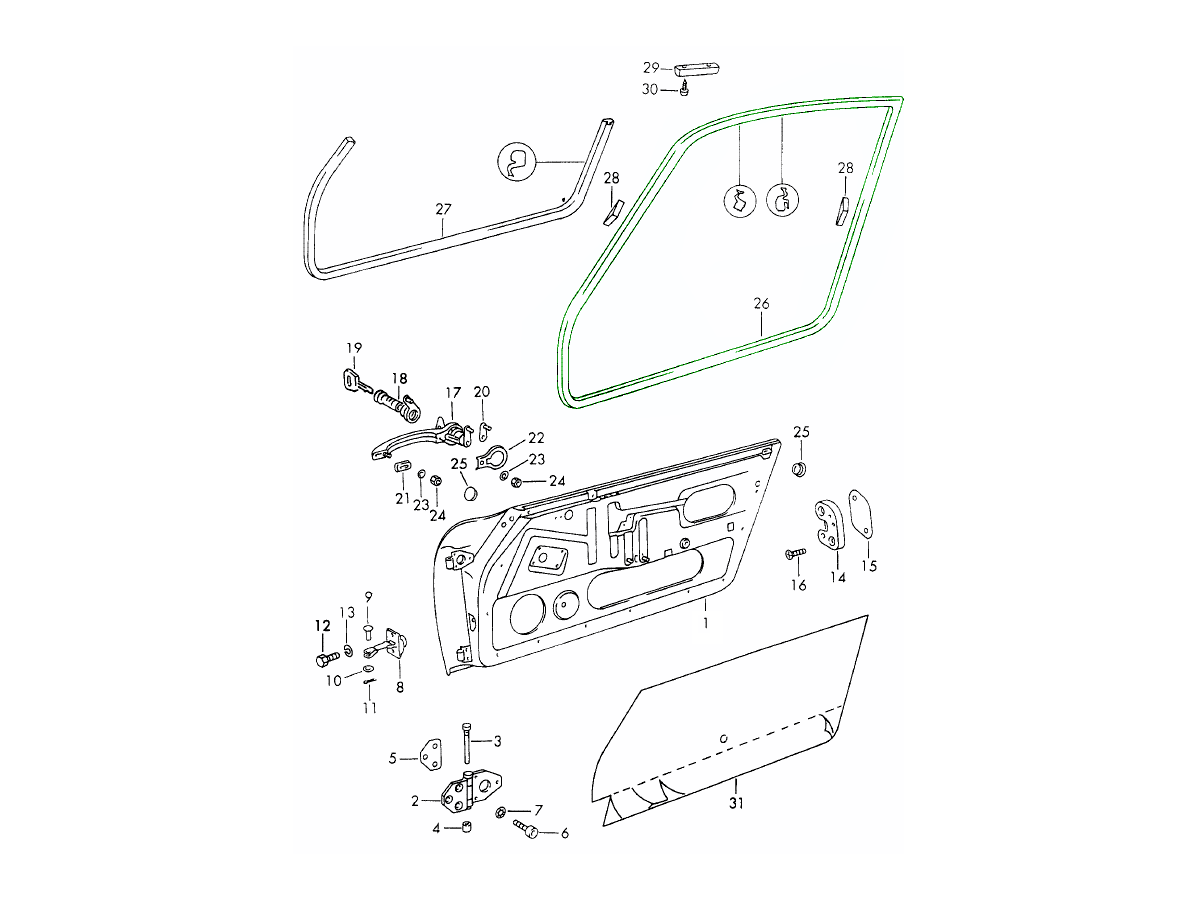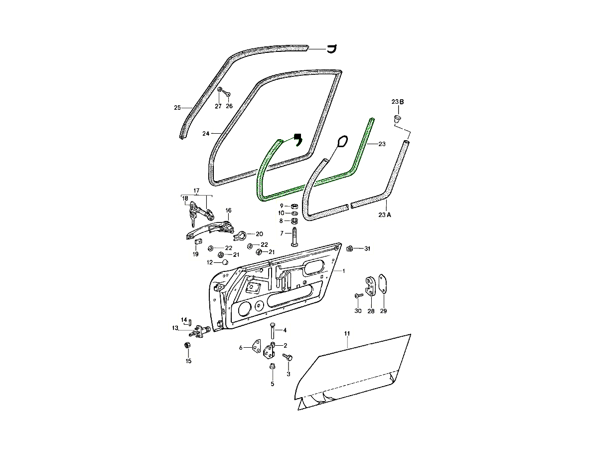 This rubber seal mounts to the door edge and is compressed when the door closes, forming a tight barrier between the door and chassis. It prevents water ingress, reduces wind noise, and maintains cabin insulation - crucial for the comfort and integrity of your classic 911.
