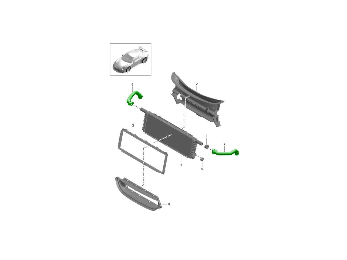 Das Kühlsystem des Porsche 992 nutzt mehrere, vorne am Fahrzeug montierte Kühler zur Regulierung der Motortemperatur. Der mittlere Kühler erhöht die Kühlleistung des Systems und trägt dazu bei, überschüssige Wärme vom Kühlmittel abzuführen.