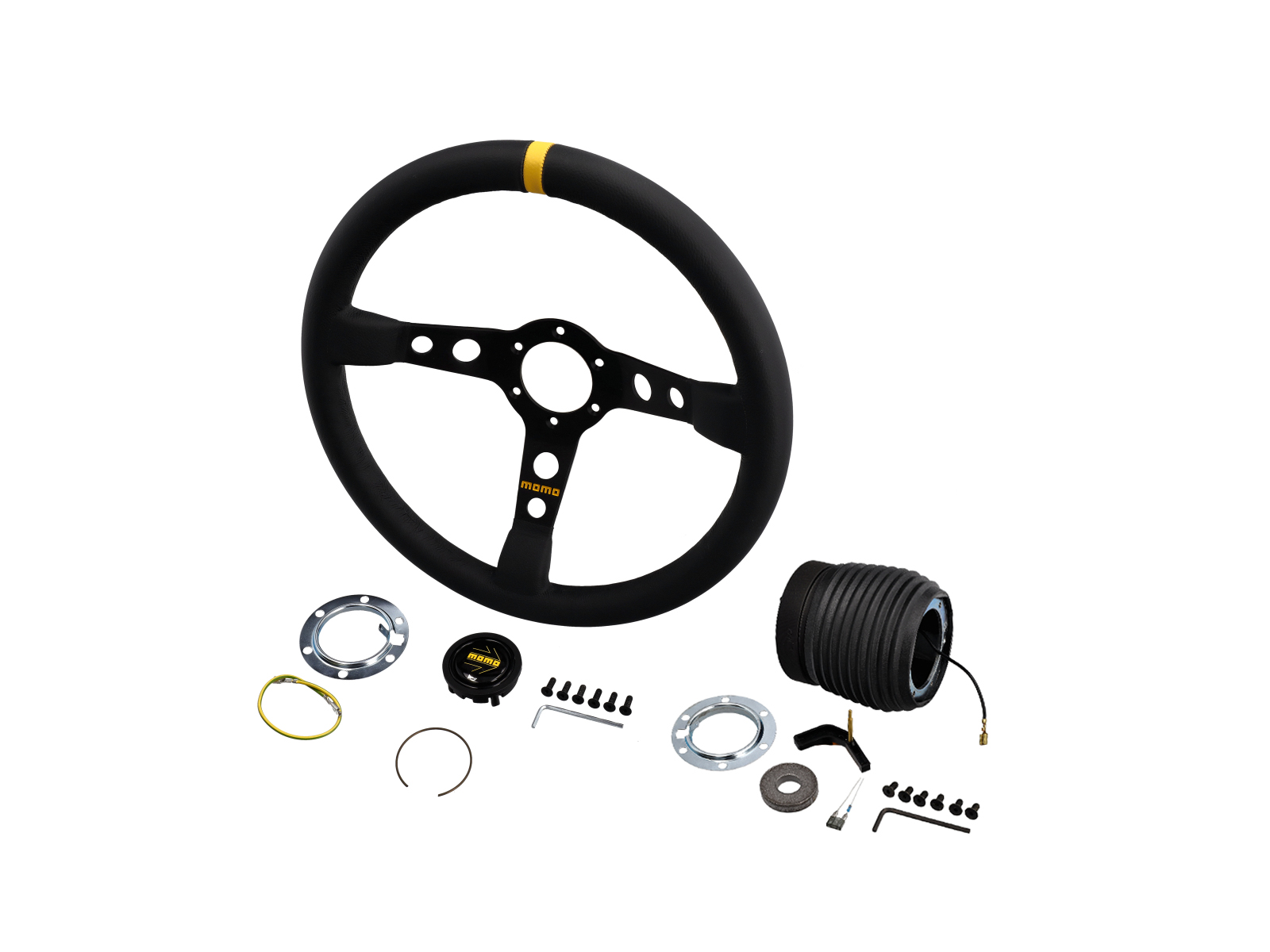 Das MOMO MOD.07-Lenkrad ist für den Einsatz in Limousinen und Rallyeautos konzipiert. Die tiefe Schale bietet dem Fahrer maximale Kontrolle und die gelbe Ledermarkierung oben ermöglicht eine schnelle Orientierung der Lenkposition. Das Lenkrad ist entweder in schwarzem Wildleder oder schwarzem Leder gehalten und verfügt über 3 schwarze Aluminiumspeichen und das MOMO Italy-Logo auf dem Hupenknopf. Alle MOMO-Rennlenkräder werden in Italien in höchster Qualität mit Rahmen aus korrosionsbeständigem Aluminium hergestellt. Der Wildleder- oder Lederbezug wird auf den Rand geklebt, anstatt genäht zu werden, um eine nahtlose Oberfläche für mehr Komfort und Haltbarkeit zu bieten.
