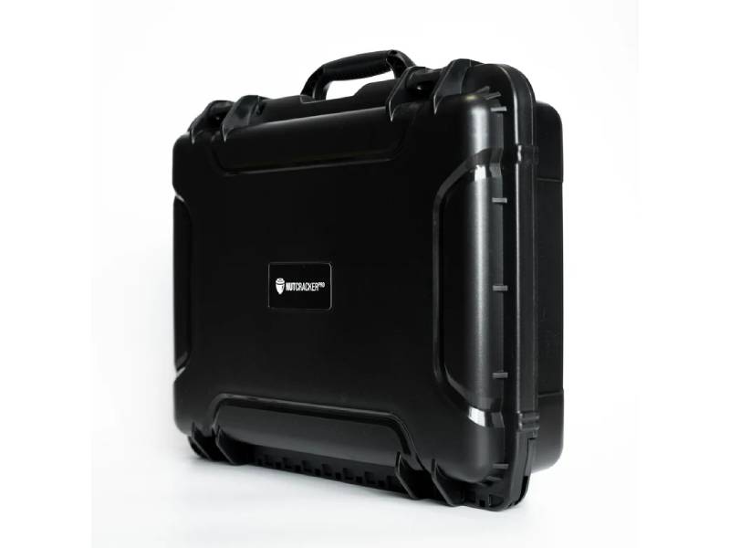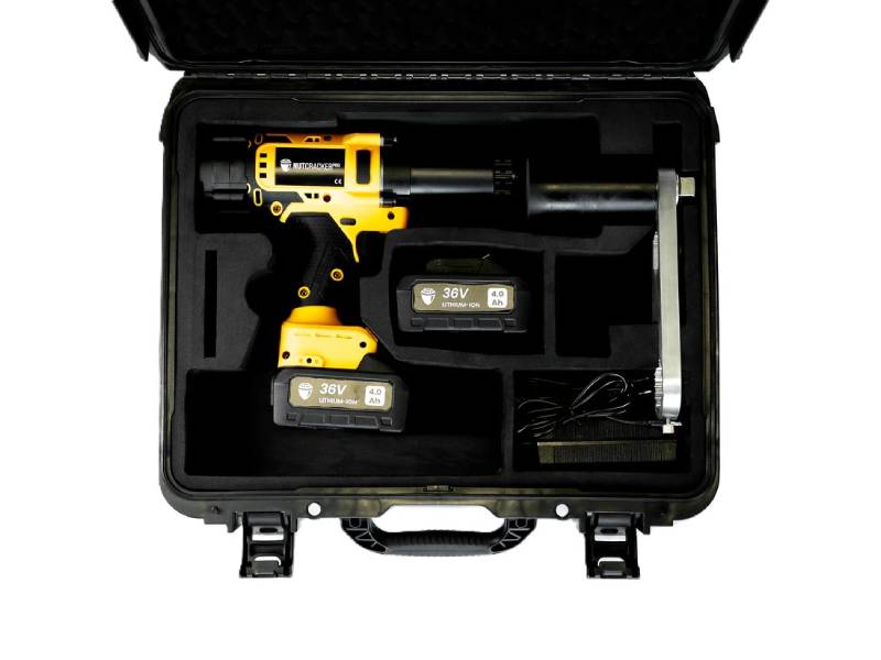NutCracker PRO, verstellbarer Reaktionsarm mit Polyurethanbeschichtung, 2 Stück 36V Li-Ionen-Akkus, Ladegerät, robuster Tragekoffer.