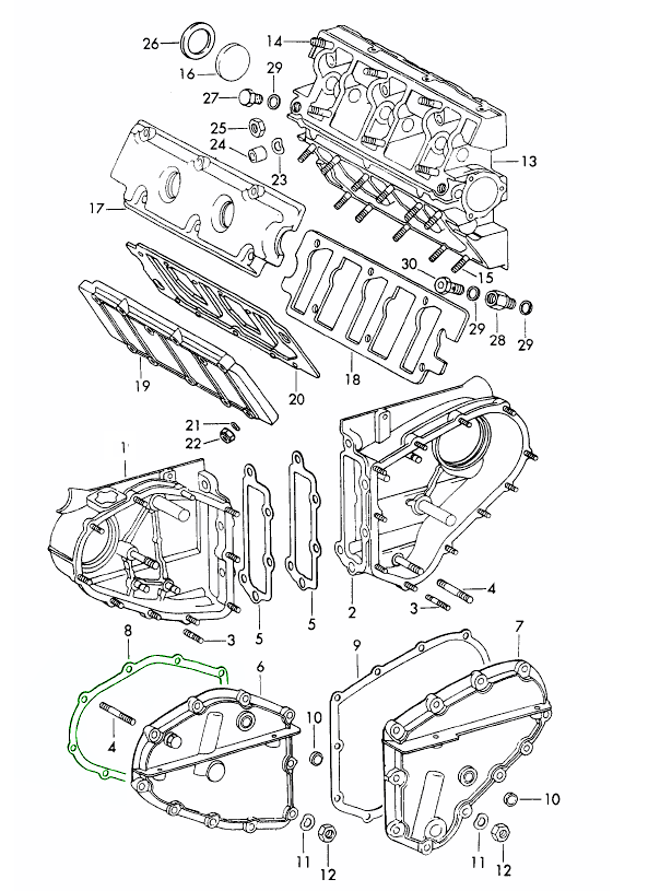 - Präzisionsgefertigte Steuergehäusedeckel und Dichtungen für Porsche-Motoren.