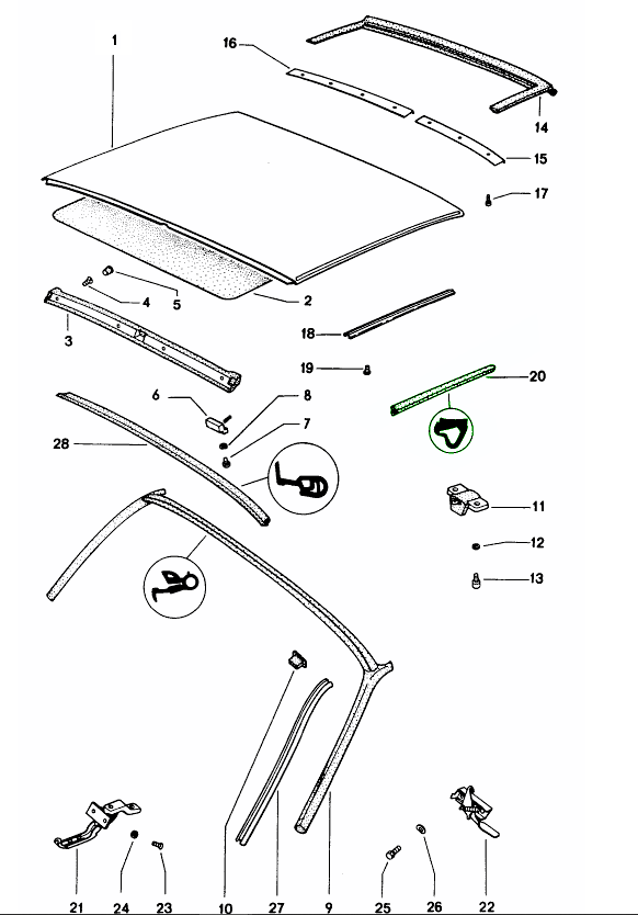 Linke und rechte Dichtung für die Fensteroberkante am Targaverdeck aus dem Dachdichtungsprofil 1974-76.