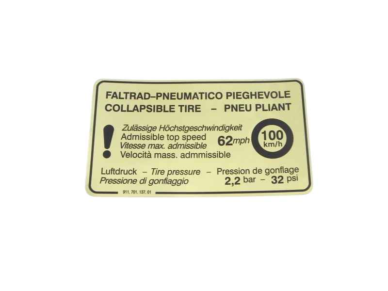 Hochwertige Reproduktion des Warnaufklebers für das zusammenklappbare Reserverad, passend für die Modelle Porsche 924 (1976–1985) und Porsche 911 (1978–1986).