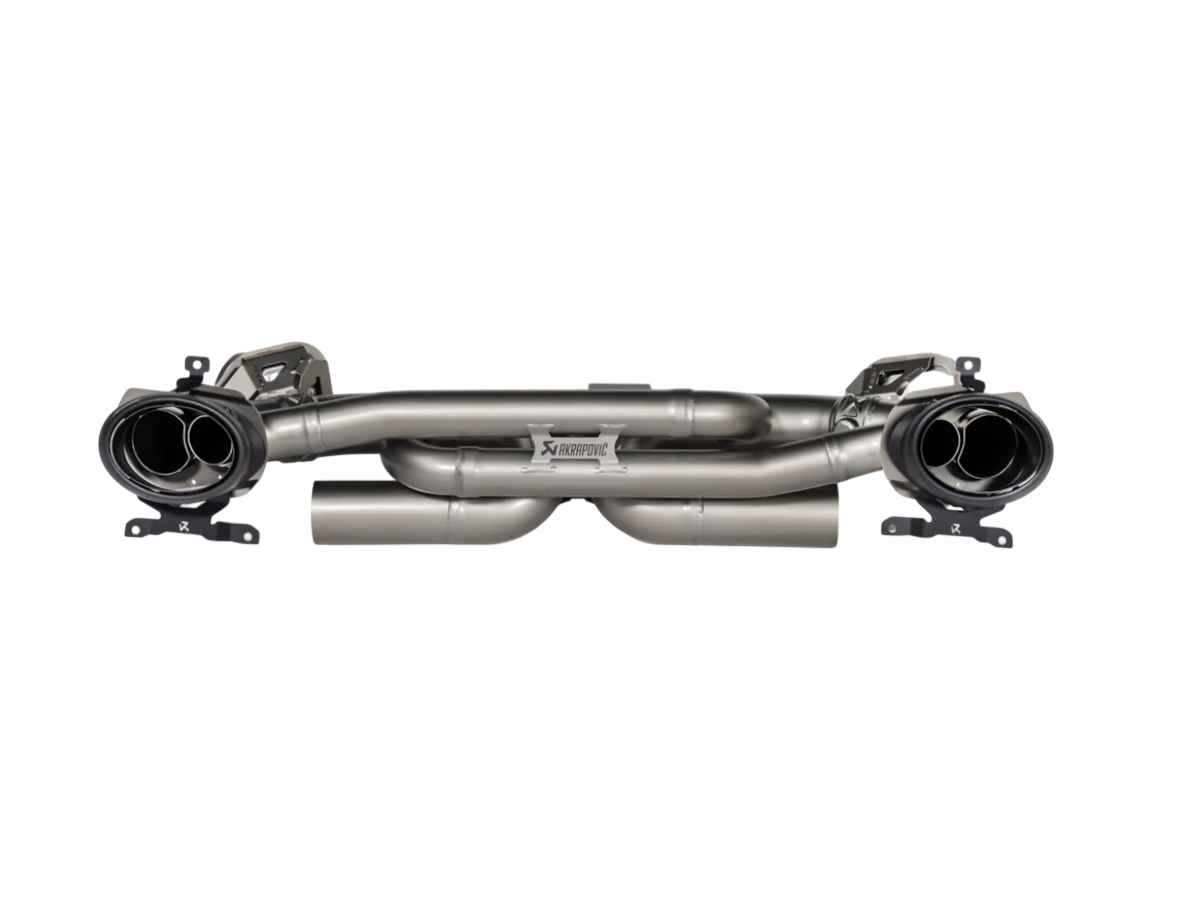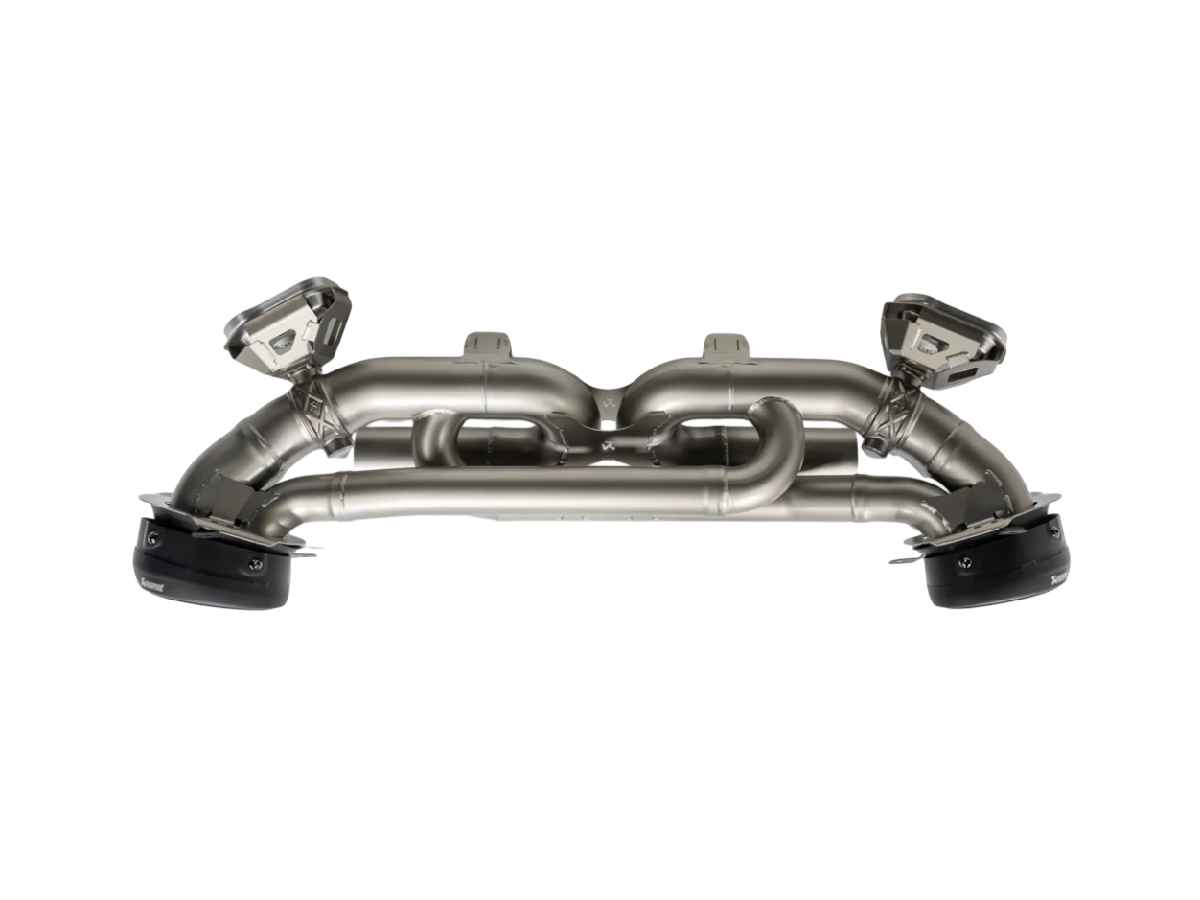 Das gesamte Wissen und die Erfahrung aus der Arbeit mit verschiedenen Motoren des Stuttgarter Sportwagenherstellers flossen in diese herausragende Aftermarket-Abgasanlage ein. Die aus leichtem Titan gefertigte Anlage verwendet komplexe, sorgfältig in der hauseigenen Titangießerei gefertigte Teile für perfekte Akustik. Vom Start weg und mit steigender Drehzahl stellt sich ein tiefer Klang ein, der das sensorische Erlebnis verstärkt. Bei niedrigen Drehzahlen erzeugt der Auspuff ein tiefes, charakteristisches Sechszylinder-Boxer-Grollen, das sich durch einen kraftvollen mittleren Bereich bewegt und sich bei hohen Drehzahlen zu einem satten, kraftvollen und hochfrequenten Klangerlebnis entwickelt. Perfekt auf das Hochschalten abgestimmt, sorgt es für ein aufregendes Erlebnis beim Einlegen der höheren Gänge und für aufregendes, rennsportinspiriertes Blubbern beim Herunterschalten. Dieses Klangbild wird durch eine sorgfältig berechnete H-Verbindung zwischen den Hauptrohren erreicht, die an einer ausgewählten Stelle präzise verschweißt ist. Das System wurde für den Einsatz auf abgesperrten Rennstrecken entwickelt, ohne Kompromisse beim Komfort einzugehen, da die Abstimmung des Systems jegliches Dröhnen oder unerwünschte Strömungsgeräusche eliminiert. Leistungs- und Drehmomentsteigerungen von +16,6 kW (22,5 PS) und +46,8 Nm bei 3.400 U/min wurden in aufeinanderfolgenden Tests auf dem Akrapovič-Prüfstand mit einem Porsche 911 Turbo (992) und der serienmäßigen Porsche-Sportauspuffanlage gemessen. Die Drehmomentkurve bot ein perfektes Ansprechverhalten bereits ab niedrigen Drehzahlen. Das System verfügt nicht über eine EG/ECE-Typgenehmigung.