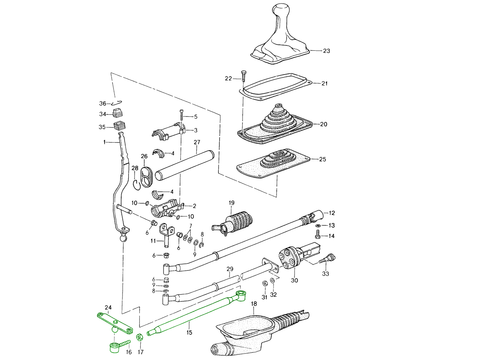 - Übertragen Sie die Bewegung vom Schalthebel auf das Getriebe.