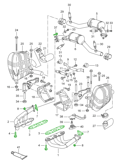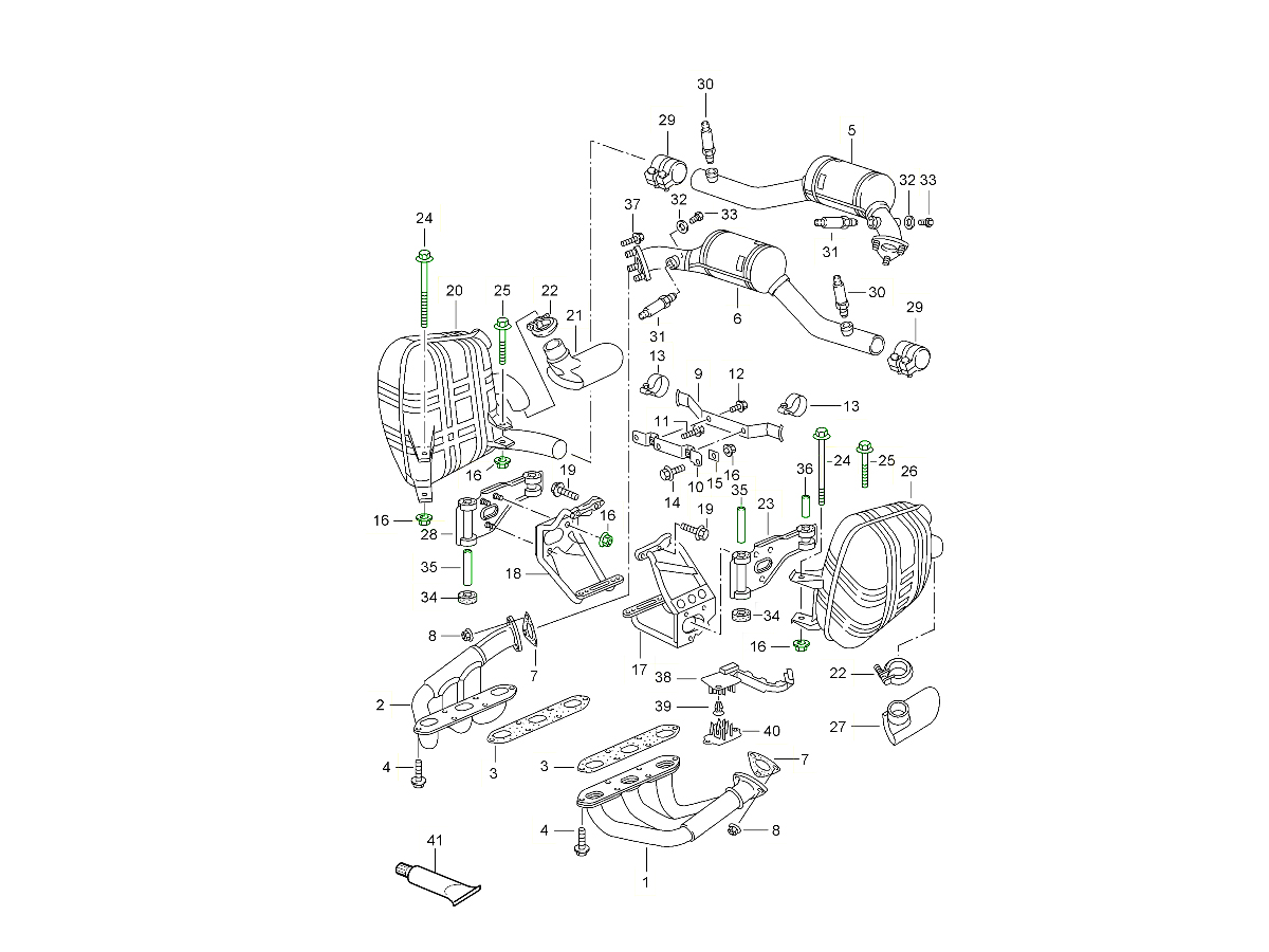 Enthält alle notwendigen Dichtungen, Klemmen, Hülsen, Muttern, Schrauben und Unterlegscheiben. Ideal, wenn Sie bei Ihrem Porsche 996 die komplette Abgasanlage wechseln - Krümmer, Katalysatoren und Schalldämpfer gleichzeitig.