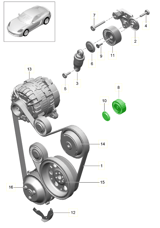 Dies ist ein direkter Ersatz für den Original-Antriebsriemen der Porsche 718 Boxster- und Cayman-Modelle mit 2,0 l. Er umschließt mehrere Riemenscheiben, darunter die Kurbelwellenriemenscheibe, den Generator, die Wasserpumpe, die Servopumpe und den Klimakompressor.