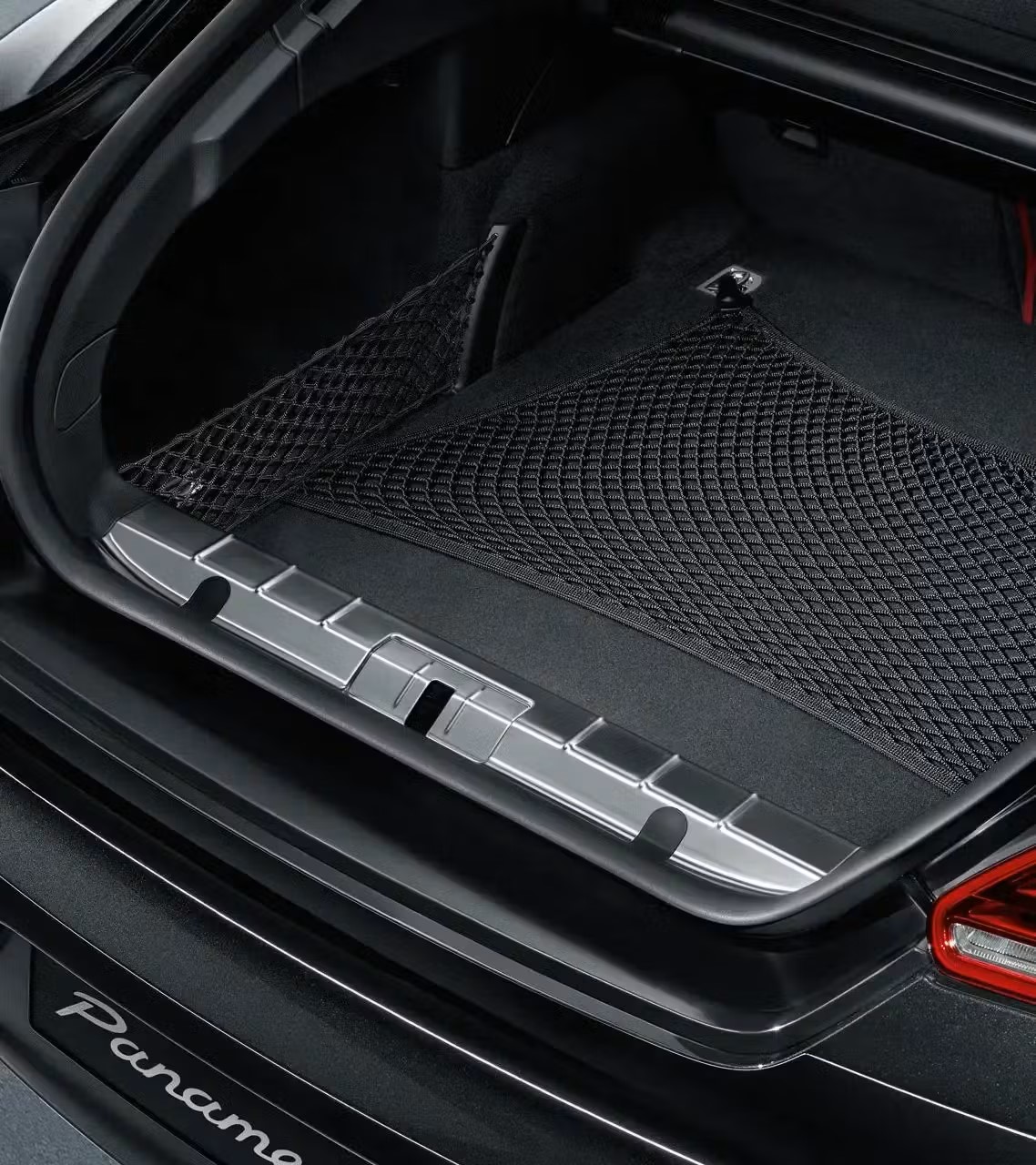 Für Ordnung im Gepäckraum – auch bei agiler Fahrweise: Der flexible Gepäckverschluss mit „PORSCHE“-Schriftzug lässt nichts verrutschen.