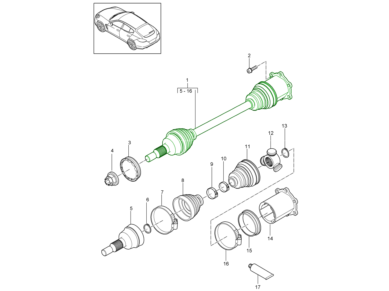 Die originale Porsche-Antriebswelle (CV-Gelenk) ist ein werkseitig spezifiziertes Bauteil der Hinterachse des Panamera (Baureihe 970). Sie sorgt für die korrekte Übertragung des Antriebsmoments vom Differenzial zur Radnabe, gleicht gleichzeitig die Federungsbewegungen aus und gewährleistet die präzise Ausrichtung.