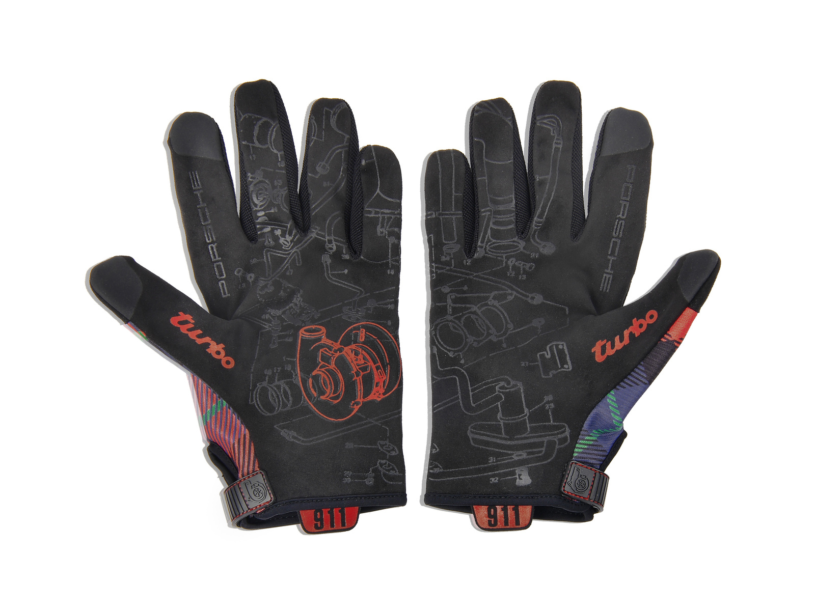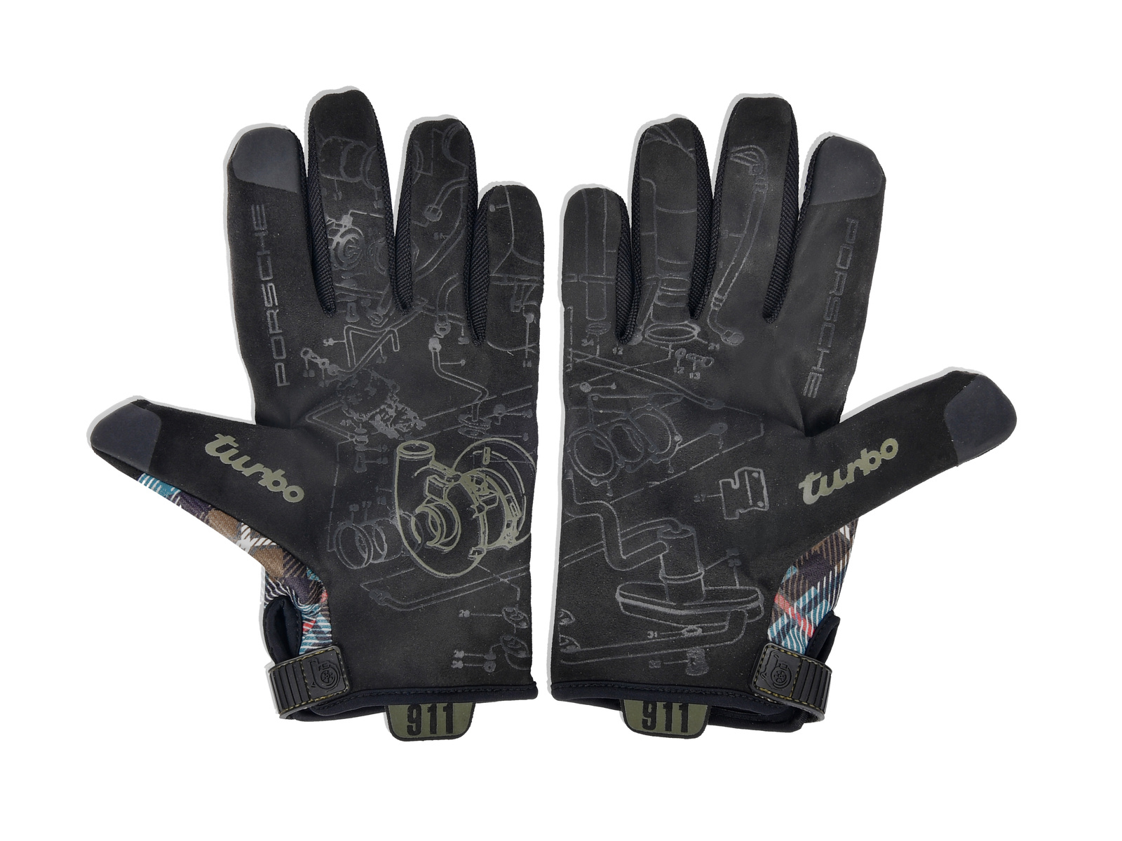 50 Jahre Turbo: Diese Porsche Classic Montagehandschuhe sind inspiriert vom berühmten Dress Mackenzie-Sitzmuster des 911 Turbo, das Ferry Porsche zu seinem 67. Geburtstag geschenkt bekam. Die griffige Handfläche ziert eine Explosionszeichnung von Teilen der Turbo-spezifischen Abgasanlage mit farblich abgesetztem Turbolader. Die Silhouette des 911 Turbo mit seinem charakteristischen Heckflügel ziert den Handrücken und verfügt über einen eingearbeiteten Magneten. Der praktische Magnet hält nicht nur kleine Befestigungselemente wie Schrauben und Muttern, sondern ermöglicht auch die einfache Befestigung der Handschuhe an Ihrem Metallwerkzeugkasten.
