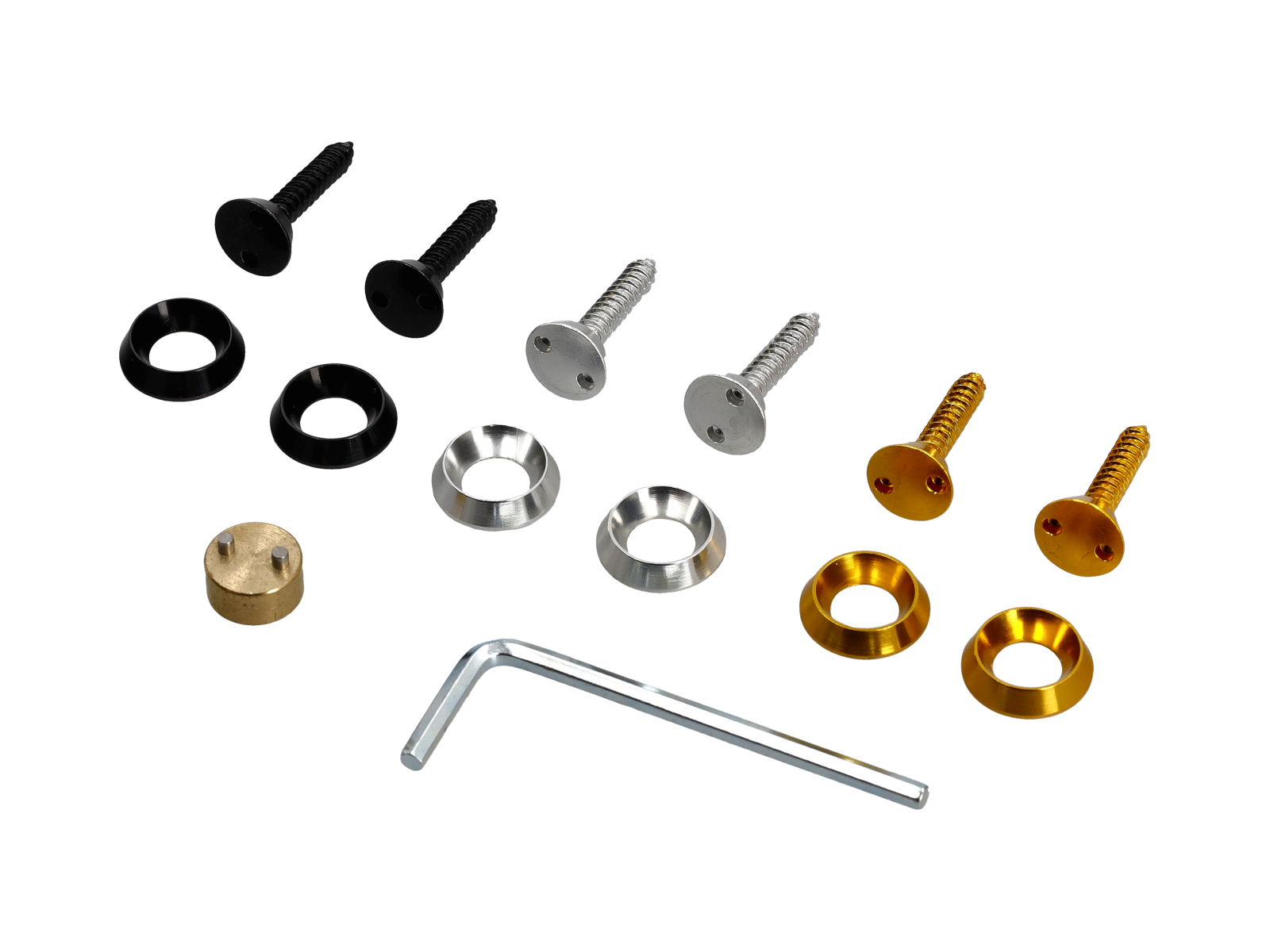 Jede Packung enthält 2 schwarze. 2 gelbe und 2 silberne Schrauben. 1 einzigartiger Verriegelungsschlüssel und 1 Inbusschlüssel.
