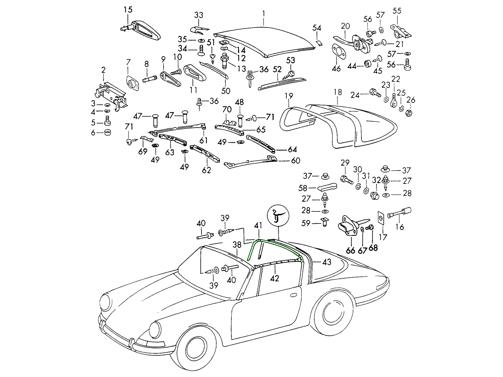 El sistema de techo Targa utilizado en los modelos clásicos del Porsche 911 cuenta con un panel de techo desmontable y una barra antivuelco fija detrás de los asientos. La junta trasera de la barra antivuelco se asienta sobre la parte superior/frontal de la barra Targa, creando una superficie de sellado hermética donde el panel de techo desmontable se une a la carrocería.