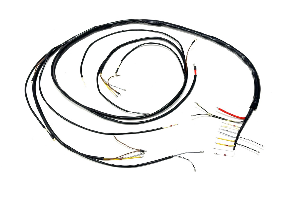 Arnés principal completo con cableado original codificado por colores. Va desde la caja de fusibles delantera hasta el tablero. El arnés encaja exactamente igual que el original. Tubo de cable y cinta resistente al aceite, como los originales. Los terminales tienen fundas de goma. El arnés incluye instrucciones detalladas de conexión.