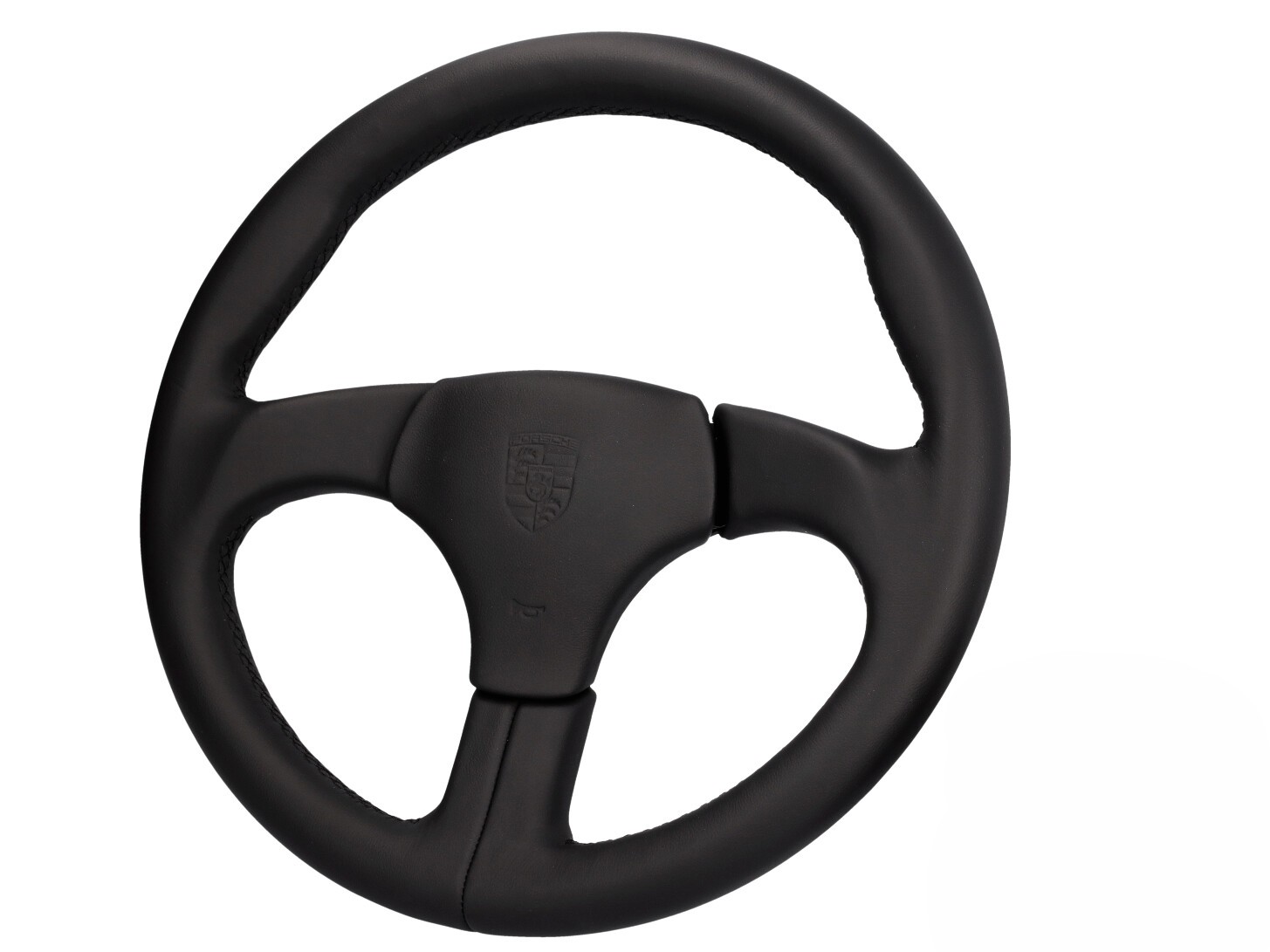 El clásico volante deportivo de tres radios con botón de bocina fabricado en cuero genuino y decorado con el histórico escudo de Porsche.