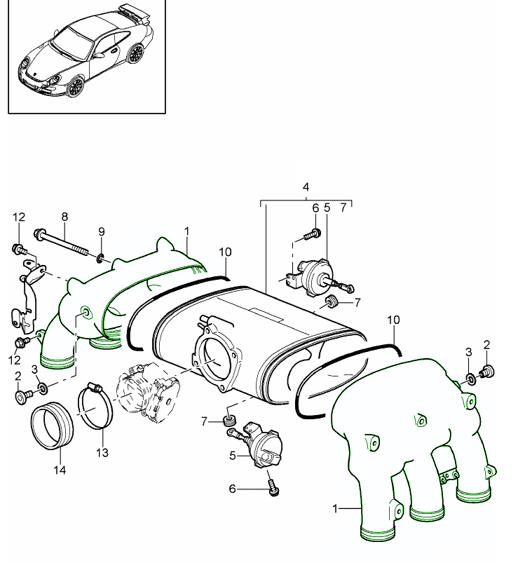 Admisión completa con todas las piezas que se ven en la imagen, fabricadas con PA12 modificado mediante un proceso industrial. Esta cámara de admisión ha sido optimizada para un Porsche 964 o un Porsche 993 e incluye todos los puertos de vacío, tanto para el vacío de los frenos como para el manejo de la válvula de resonancia.