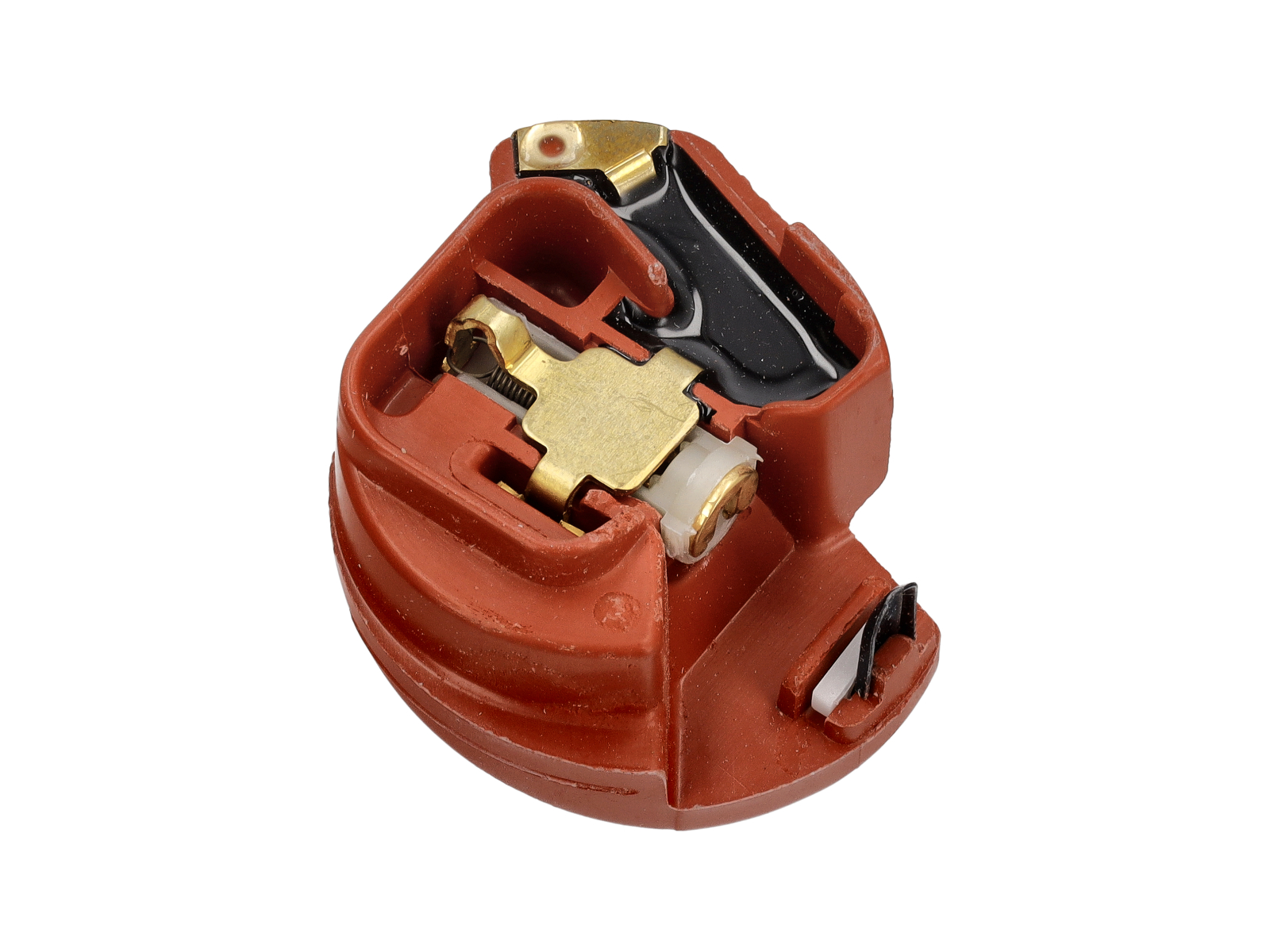 La cabeza del "rotor" está unida a la parte superior del eje del distribuidor que es impulsado por un engranaje en el árbol de levas del motor y, por lo tanto, sincronizado con él. Este rotor se presiona contra una escobilla de carbón en el terminal central de la tapa del distribuidor que se conecta a la bobina de encendido ya sea a través de la parte superior y conectado directamente a la bobina en los sistemas HEI, o a través del terminal central en los sistemas de encendido de puntos y conectado de forma remota a la bobina. bobina.