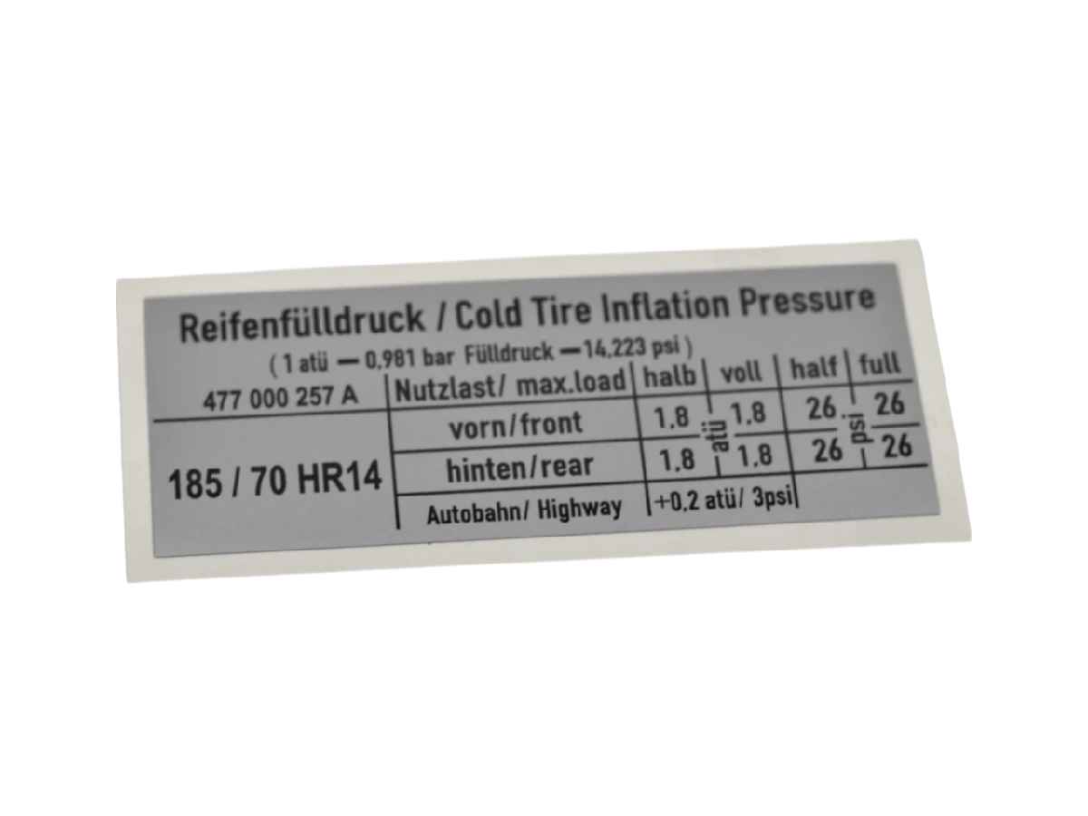 Esta calcomanía estilo OEM está diseñada para colocarse en el interior del tapón del depósito de combustible, mostrando las especificaciones correctas de presión de los neumáticos suministradas originalmente por Porsche. Garantiza tanto el funcionamiento seguro del vehículo como una presentación impecable, tal como la proporcionó Porsche.