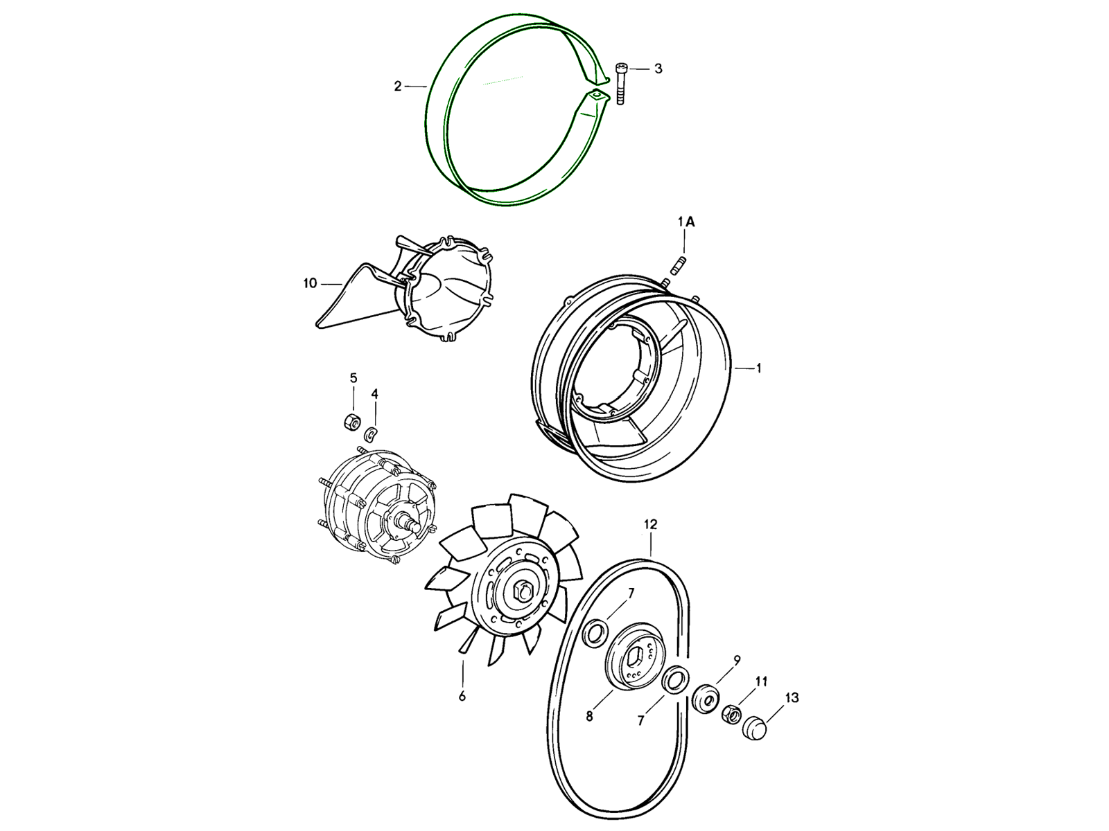 La correa de la carcasa del impulsor/ventilador del alternador asegura el conjunto del ventilador de enfriamiento a la estructura del motor, manteniéndolo correctamente posicionado y estable durante el arranque del motor, la vibración y el ciclo térmico.