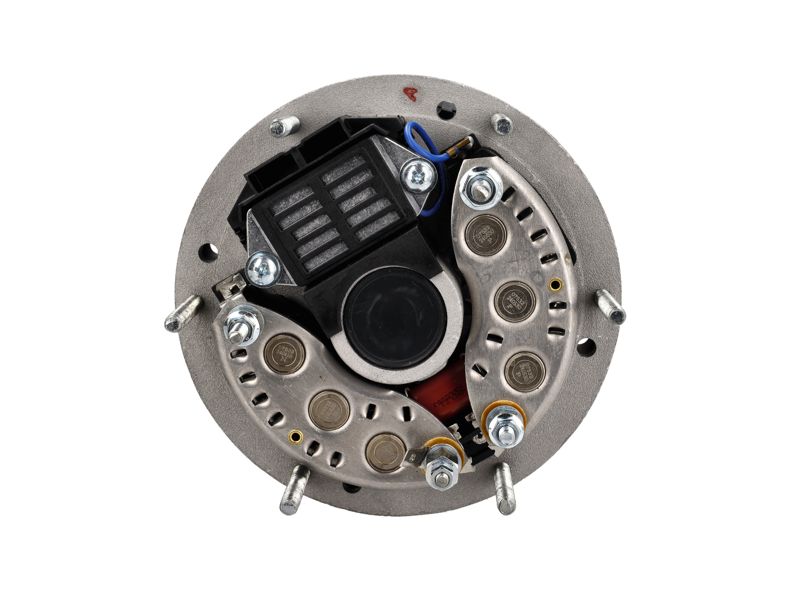Se monta en la parte trasera del alternador o del cubo del alternador, atornillado a la carcasa del ventilador o cubierta de ventilación o junto a ella.