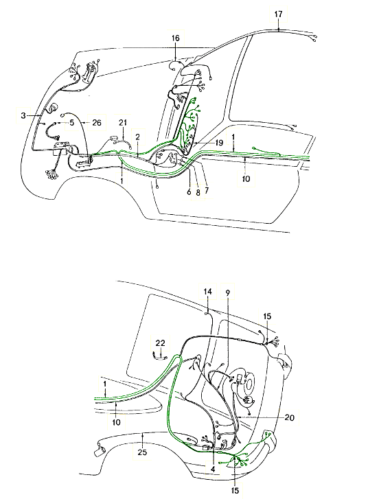 Arnés de túnel 911 completo con cableado original en espiral codificado por colores.