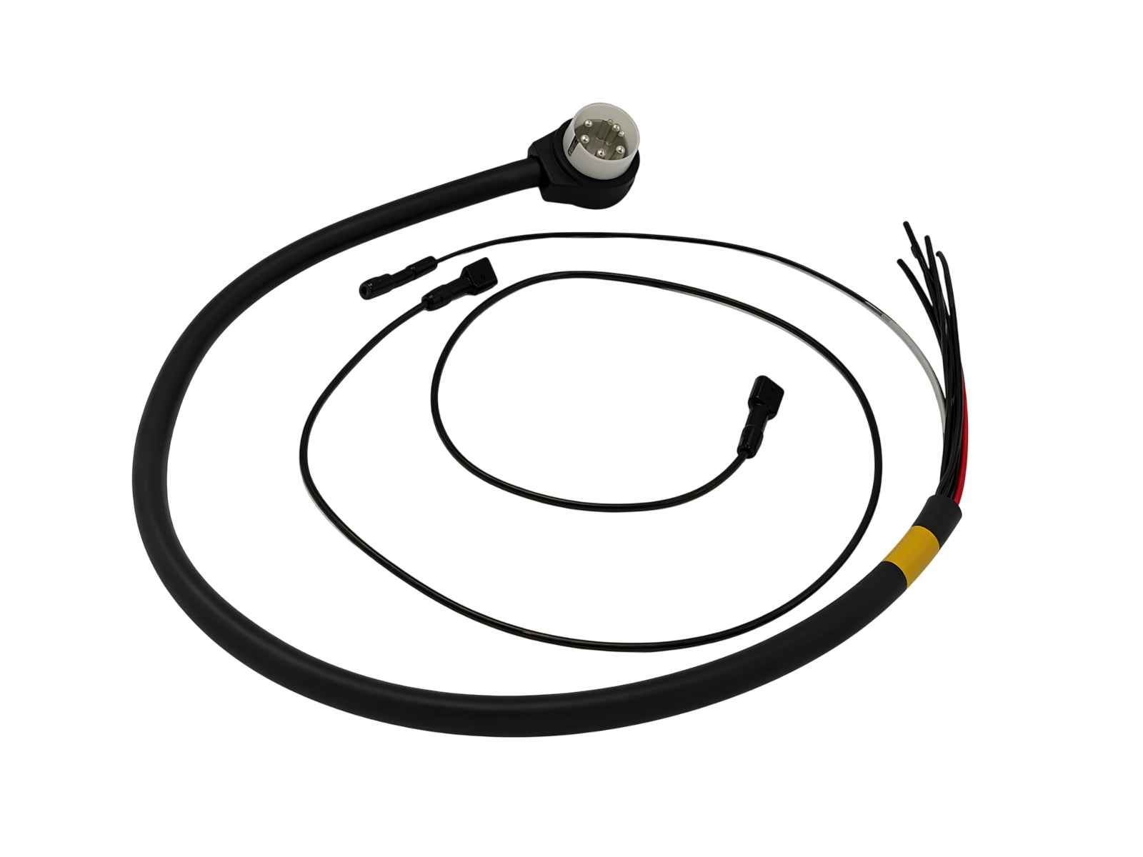 Tubo de alambre y cinta resistente al aceite, como los originales. Los terminales tienen fundas de goma y el arnés incluye instrucciones detalladas de conexión. Se incluyen dos conectores macho nuevos de 6 polos y un conector hembra de 14 polos.