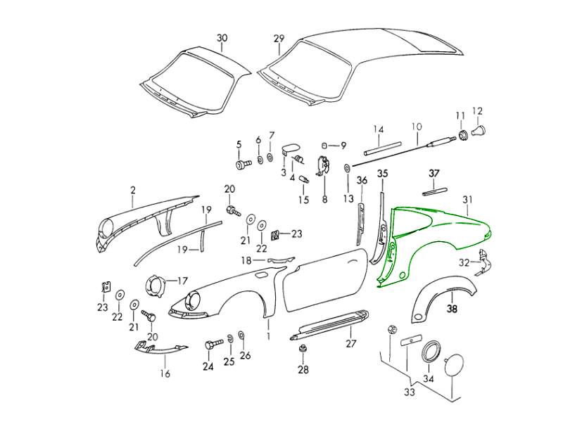 Alerones traseros y paneles laterales Porsche, tanto originales como de reproducción, que restauran la forma y alineación originales de la carrocería. Disponibles en acero, aluminio y materiales ligeros.