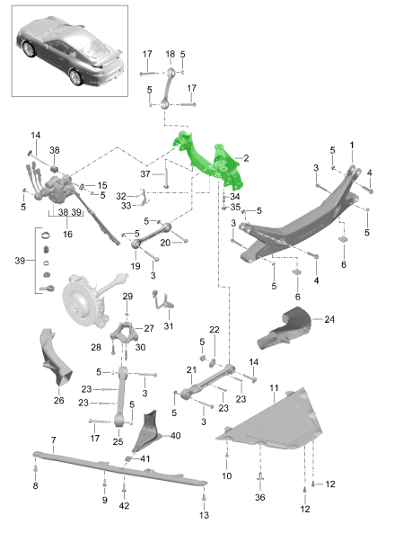La sección lateral de la suspensión o subchasis es uno de los elementos estructurales más importantes del chasis de su Porsche. Proporciona una base rígida que conecta los brazos de suspensión, la cremallera de dirección y los componentes del tren de potencia a la carrocería, manteniendo la alineación, la estabilidad y una conducción precisa. Un subchasis sólido garantiza que la geometría de la suspensión se mantenga estable bajo carga, ofreciendo una respuesta de dirección predecible y un control que inspira confianza a cualquier velocidad.