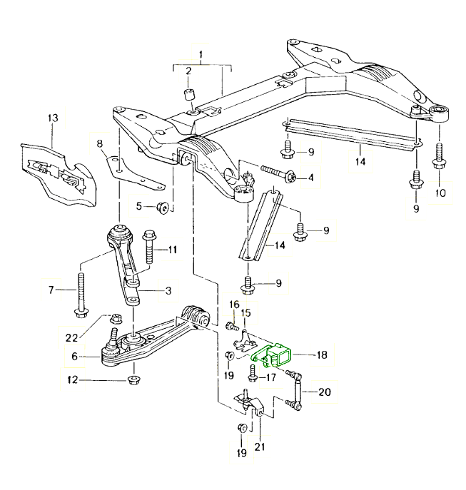 Este perno asegura el brazo de control de la suspensión trasera al soporte de la rueda o al bastidor auxiliar, proporcionando la fuerza de sujeción necesaria para mantener una alineación precisa de la suspensión y minimizar el movimiento bajo carga.