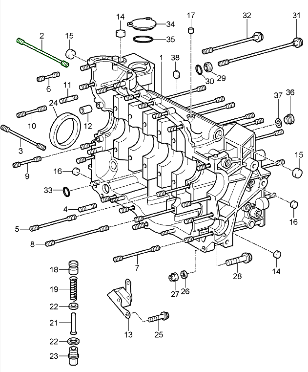 El cárter constituye el núcleo de cada motor Porsche y alberga componentes giratorios clave como el cigüeñal, los cojinetes y las bielas. Proporciona rigidez estructural, contención de aceite y una alineación precisa de las piezas móviles del motor, lo que lo hace crucial tanto para el rendimiento como para la longevidad.