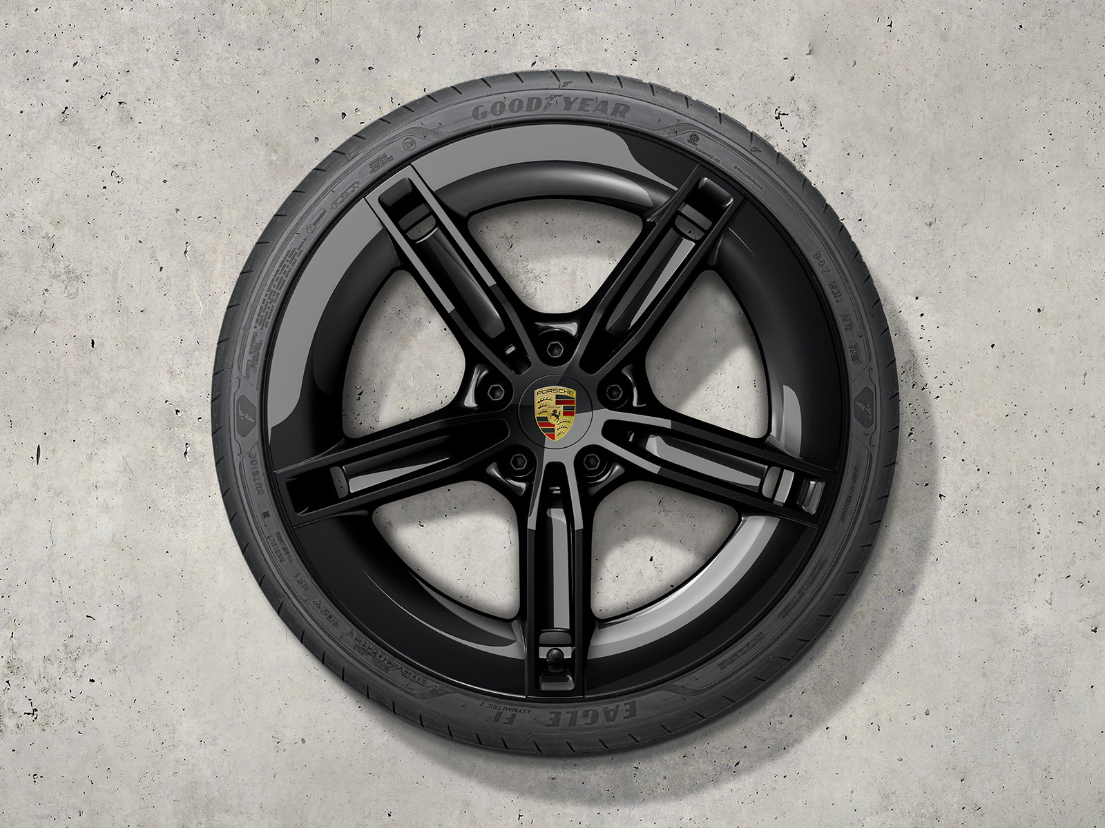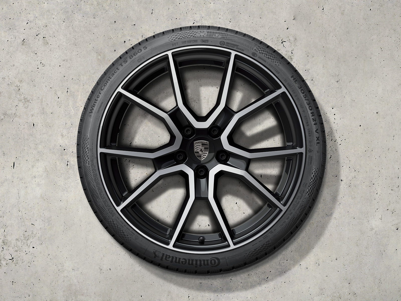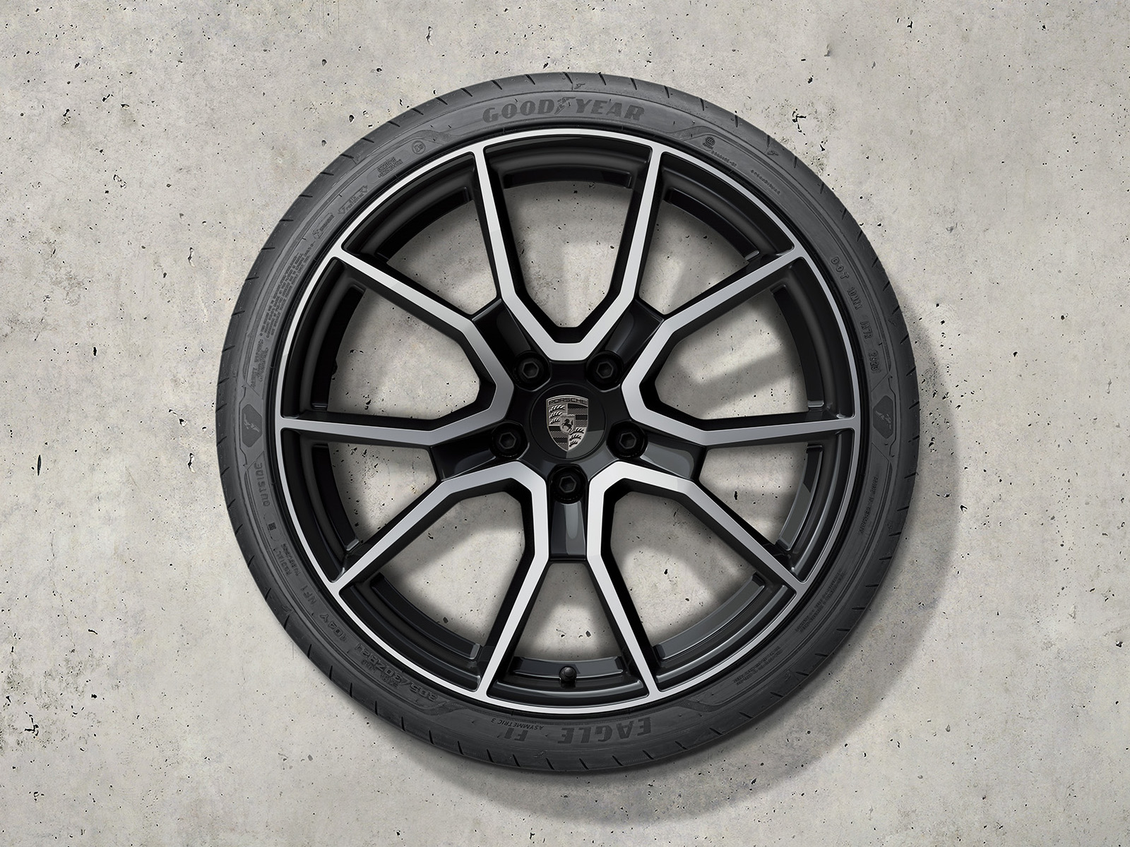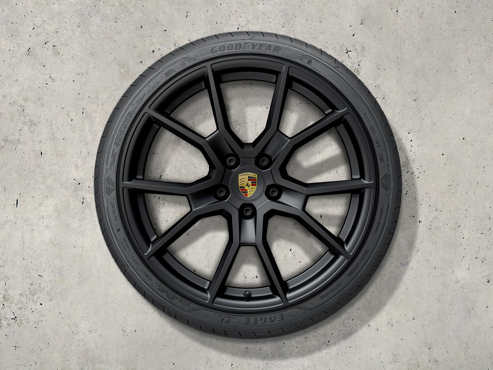 Juego de ruedas y neumáticos de verano de diseño exclusivo Taycan de 21 pulgadas, pintados en negro (alto brillo) con Aeroblades Carbon.