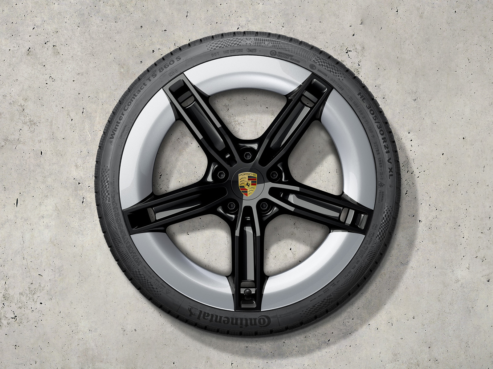 Juego de ruedas y neumáticos de verano de diseño exclusivo Taycan de 21 pulgadas, pintados en negro (alto brillo) con Aeroblades pintados en blanco (alto brillo).