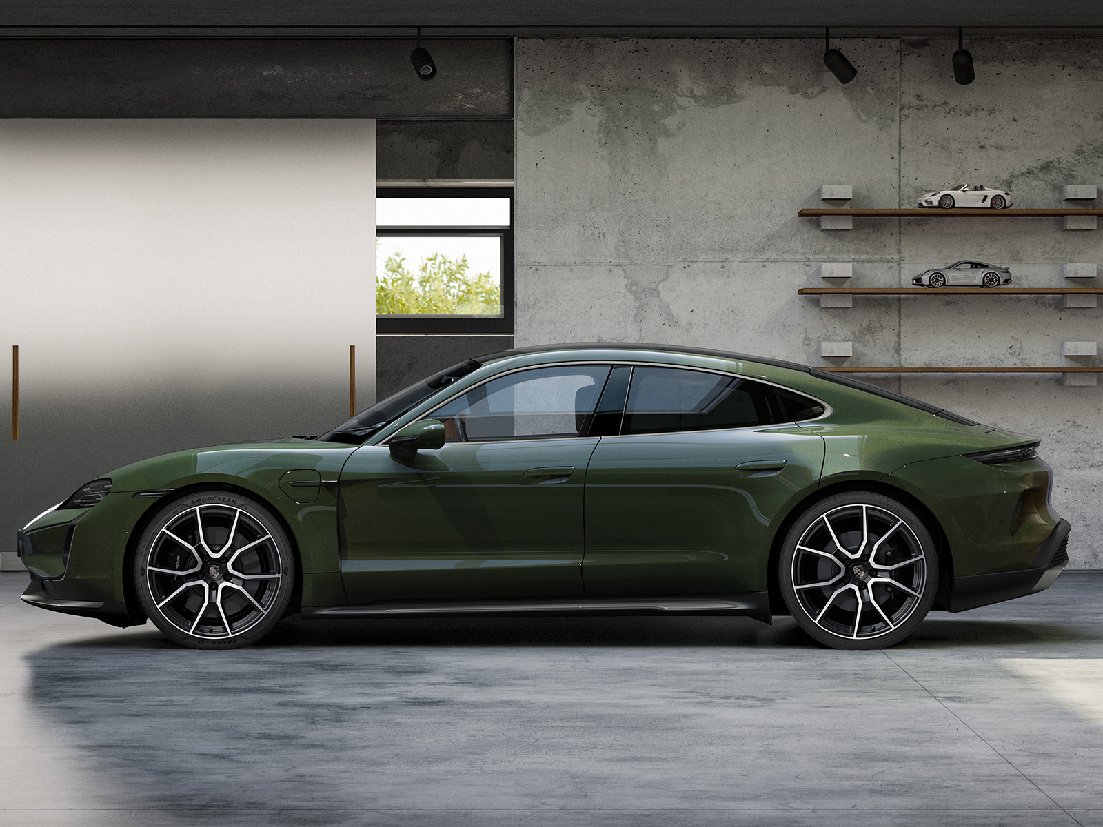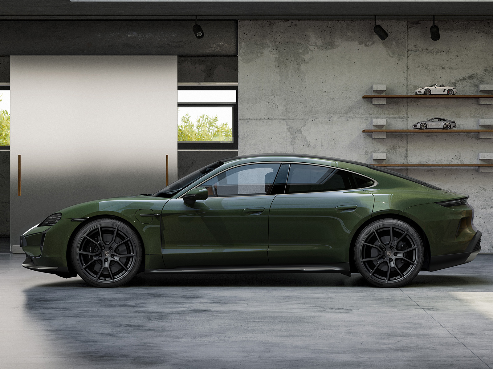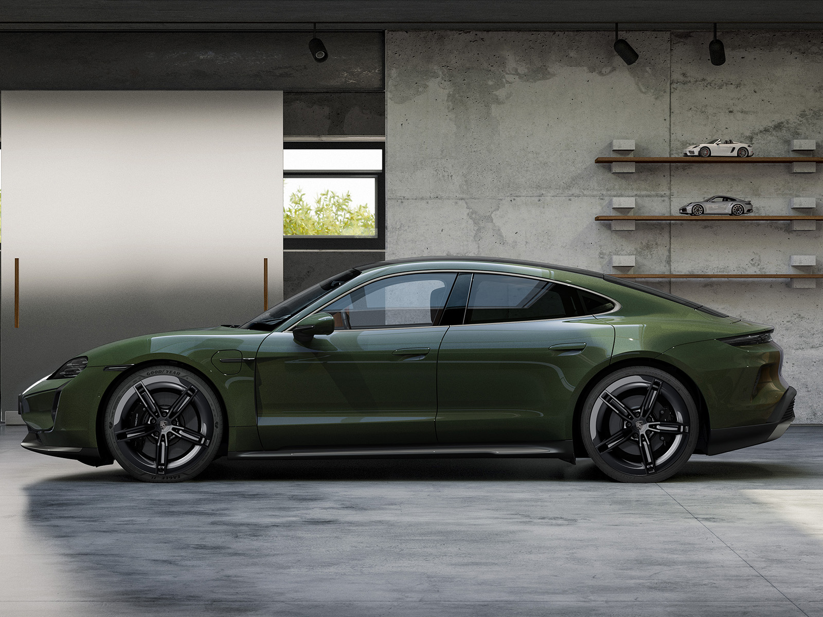 Llantas forjadas en diseño de 5 radios basadas en el diseño del estudio conceptual Porsche Mission E, pintadas en Turbonite.