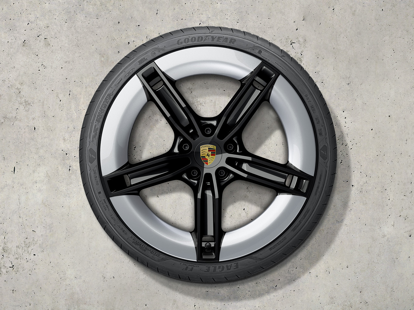 Llantas forjadas en diseño de 5 radios y efecto bicolor en plata brillante/negro (alto brillo) basadas en el diseño del prototipo Porsche Mission E.