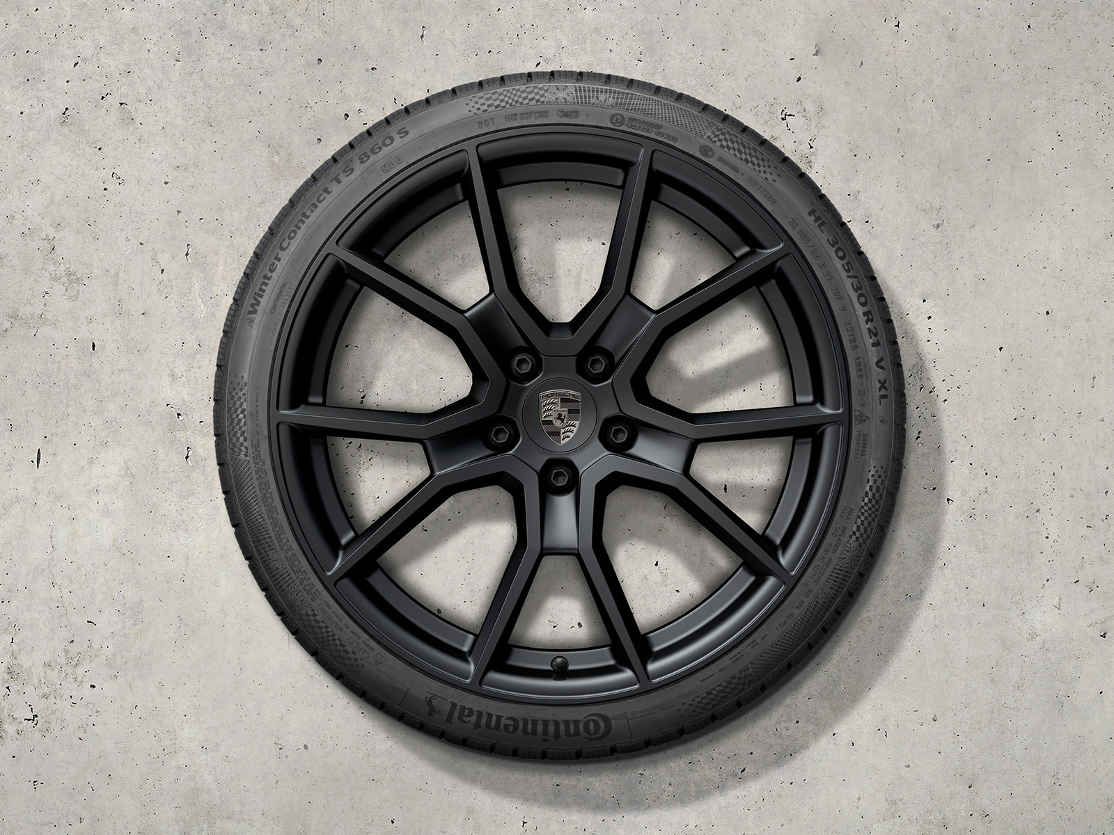 Juego de ruedas y neumáticos de invierno de 21 pulgadas, diseño Mission E, pintados en negro (alto brillo).
