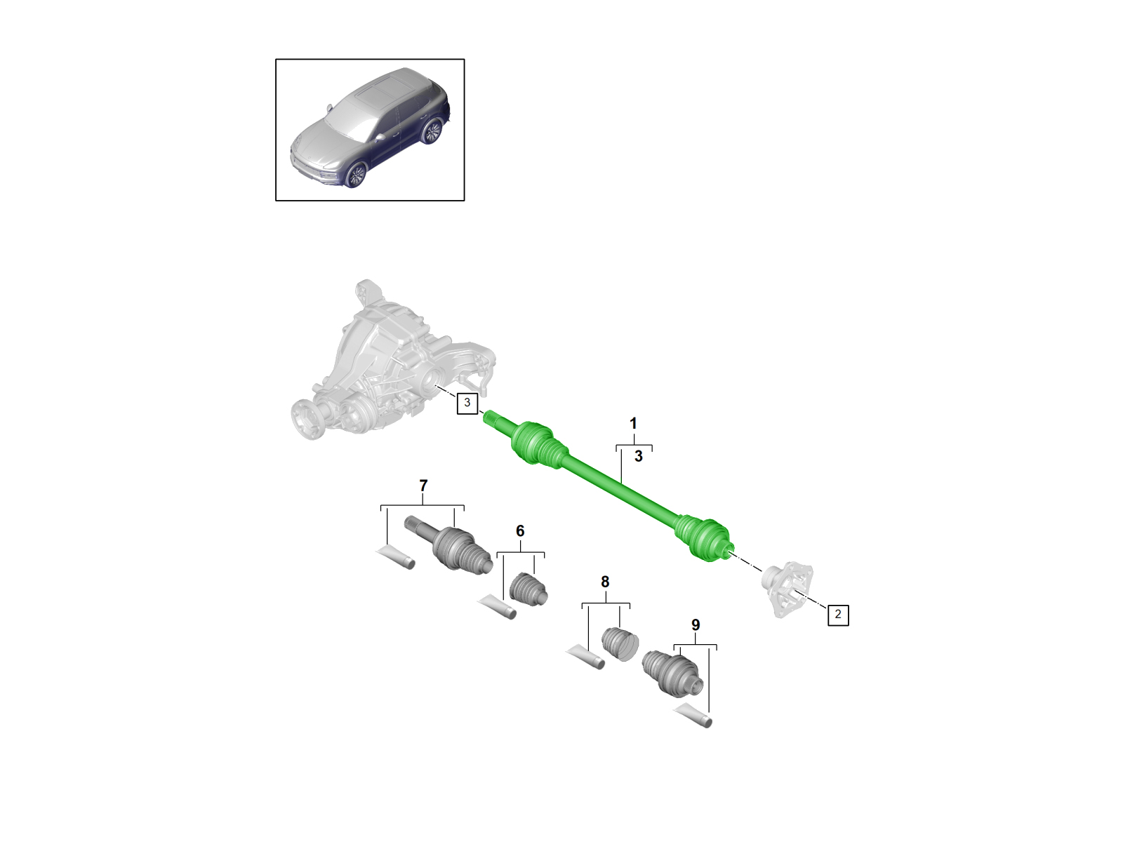 Un conjunto de eje de transmisión trasero de equipo original (OE) genuino de Porsche, también conocido como eje de velocidad constante (CV), instalado entre el diferencial trasero y el cubo de la rueda trasera para proporcionar torque en los modelos Porsche Cayenne (9YA) equipados con motores de 6 cilindros.