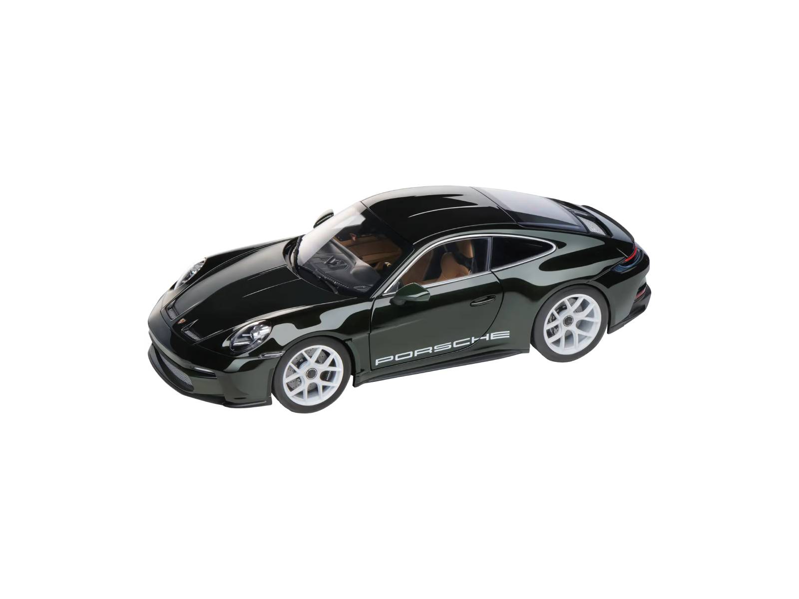 La exclusiva maqueta a escala 1:18 del Porsche 911 S/T (992) con puertas que se abren demuestra una impresionante atención al detalle y merece un lugar en cualquier colección. Su embalaje también lo convierte en el regalo perfecto para todos los fans de Porsche. Fundición a presión. Exterior verde oliva, exterior coñac.