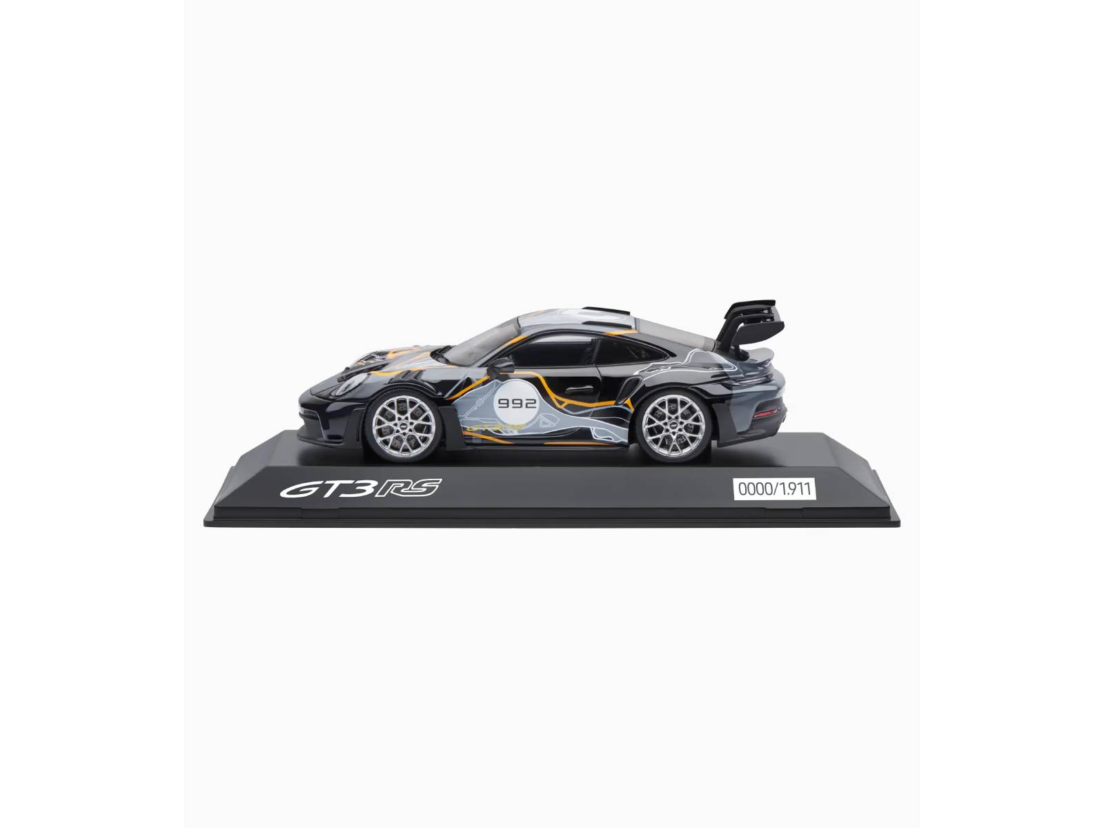 El Porsche 911 GT3 RS (992) – Edición Limitada a escala 1:18 captura el rendimiento sin concesiones y la precisión aerodinámica del deportivo de competición definitivo de Porsche. Con un acabado en un exclusivo Gris con detalles en Naranja, este modelo refleja el singular diseño "Pista de Pruebas de Weissach", que celebra la incansable búsqueda del rendimiento de Porsche en su legendario centro de desarrollo.