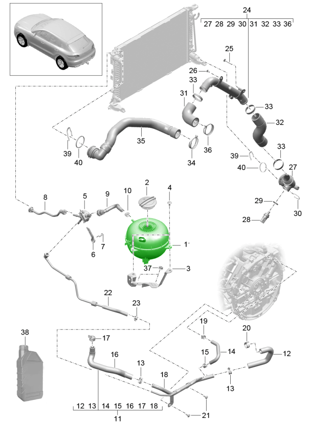 Los depósitos de refrigerante (también conocidos como depósitos de expansión) son una parte vital del sistema de refrigeración de su Porsche. Almacenan el exceso de refrigerante y gestionan las fluctuaciones de presión a medida que el motor se calienta y se enfría. Al mantener los niveles de refrigerante y la presión del sistema adecuados, ayudan a prevenir el sobrecalentamiento, los daños en el motor y la pérdida de refrigerante, garantizando un rendimiento y una fiabilidad óptimos.