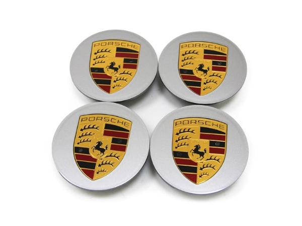 Juego de tapacubos (4 uds.) Cóncavos con escudo Porsche en color, en Cromo Brillante.