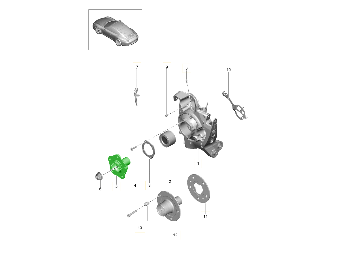 El cubo de rueda y el portarrueda son componentes esenciales del sistema de suspensión y eje de su Porsche. Juntos, forman el punto de montaje central para la rueda, el disco de freno y el conjunto de rodamientos, lo que permite una rotación suave y una alineación precisa. El portarrueda (o muñón) se conecta a los brazos de suspensión y al sistema de dirección, manteniendo una geometría precisa para mayor estabilidad, seguridad y control.