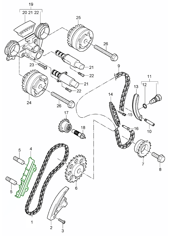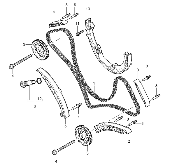 Una cadena de distribución conecta el cigüeñal a los árboles de levas, garantizando una sincronización precisa de las válvulas. El tensor mantiene la cadena tensa para evitar holgura, vibraciones y ruidos, manteniendo una sincronización precisa en cualquier condición de carga.