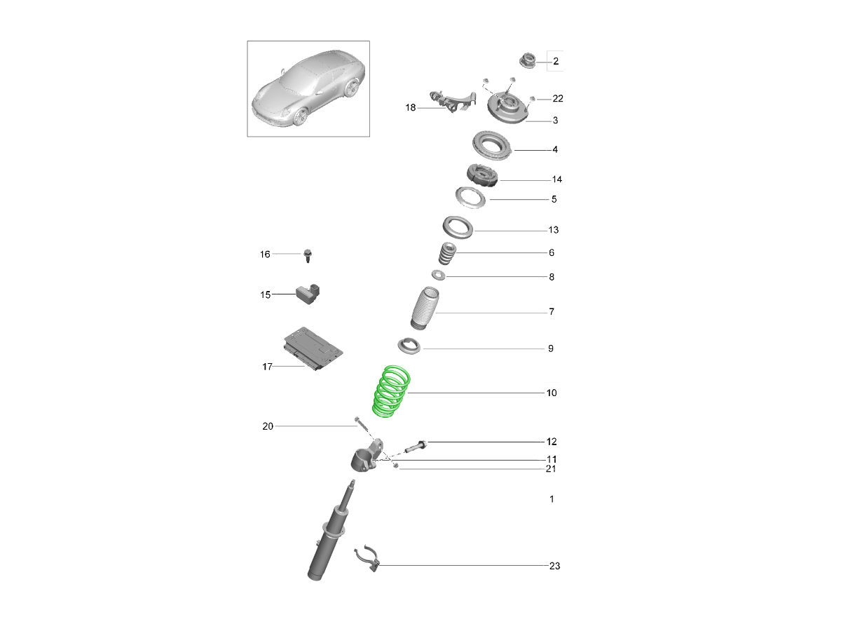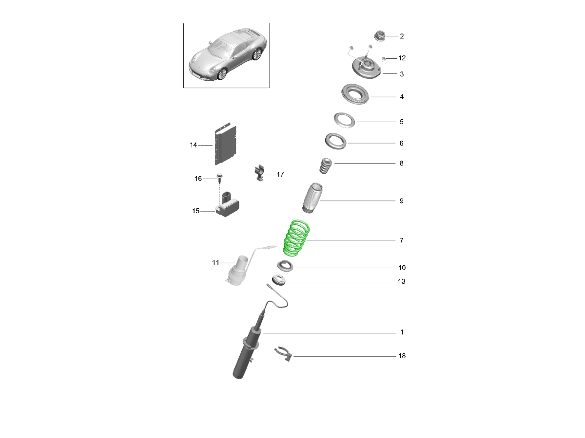 Ce ressort hélicoïdal soutient un coin avant du véhicule et gère la compression et la détente de la suspension lors du freinage, de l'accélération et des virages. Spécialement conçu pour les modèles M030/M031, il contribue à maintenir la hauteur de caisse abaissée et la maniabilité précise de la suspension sport Porsche.