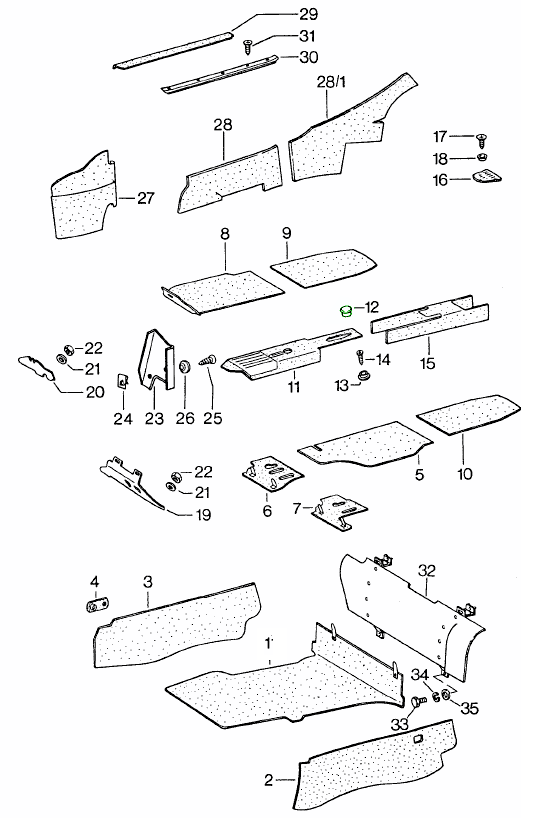 Jeu de moquettes complet de 16 pièces pour les modèles Porsche 911 et 912 Coupé à empattement long (LWB), 1969-1973. Nos ensembles de tapis fabriqués à la main sont parmi les meilleurs que vous puissiez acheter en termes d'originalité et d'ajustement. Nous respectons étroitement les spécifications de l'usine de Stüttgart ; des matériaux, des couleurs, des coutures, des bordures, jusqu'aux boutons et au rembourrage du talon.