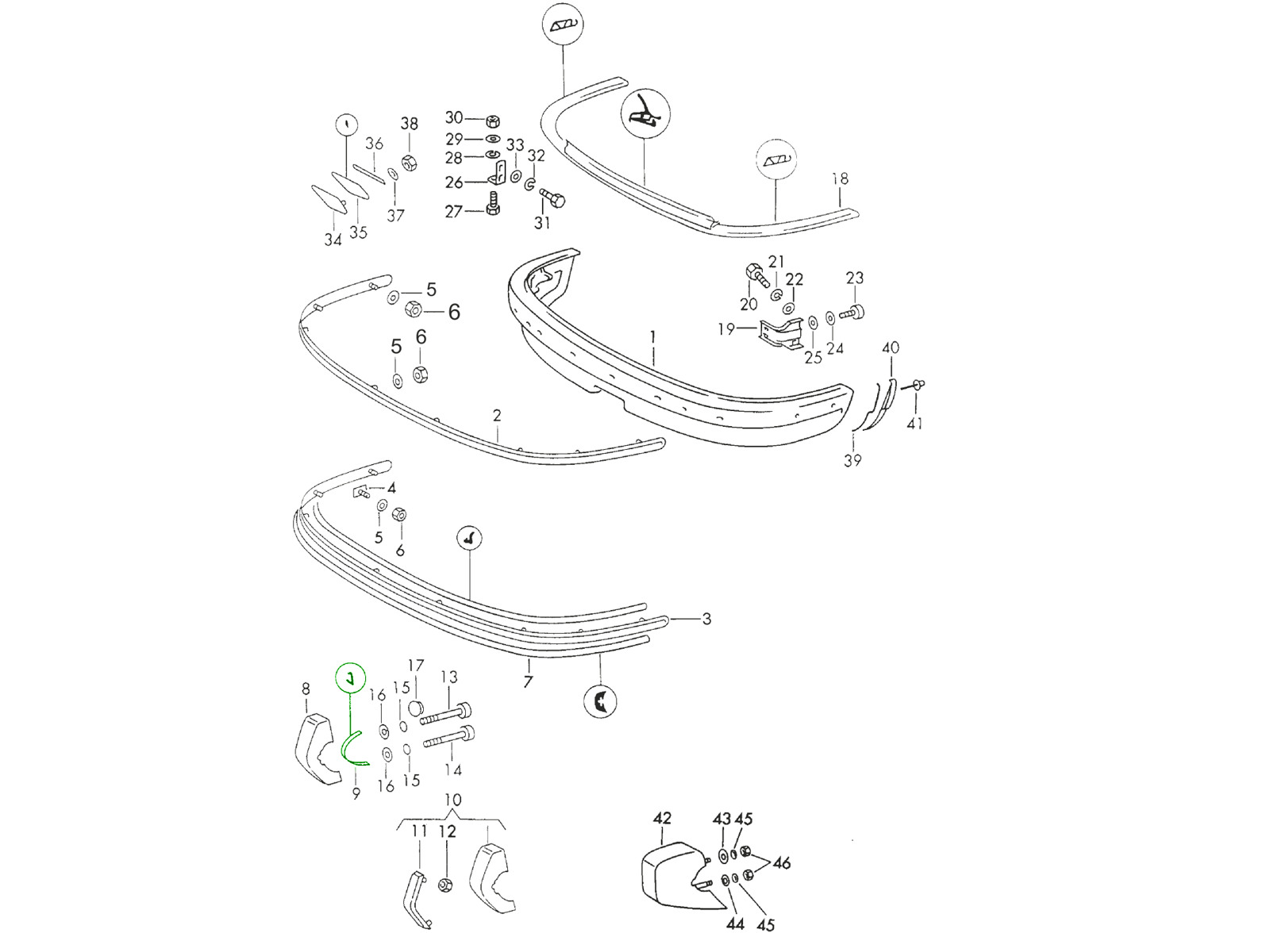 Garnitures en caoutchouc souple protégeant les bords des pare-chocs et assurant une transition fluide entre les panneaux de carrosserie. Disponibles pour les modèles Porsche classiques et modernes.