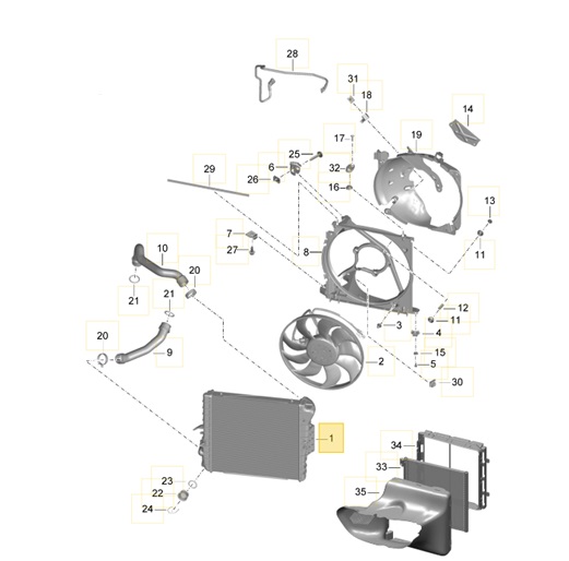 - Radiateur : dissipe la chaleur du liquide de refroidissement du moteur pour maintenir des températures de fonctionnement sûres.