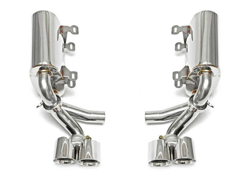 • Le système conserve la position d'échappement/silencieux d'origine de la 997 Carrera, mais comporte des extensions de sortie plus longues avec des embouts polis de 3,5 pouces qui sortent au centre des pare-chocs de style GT3.