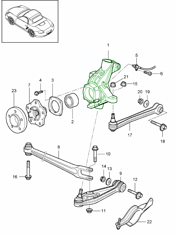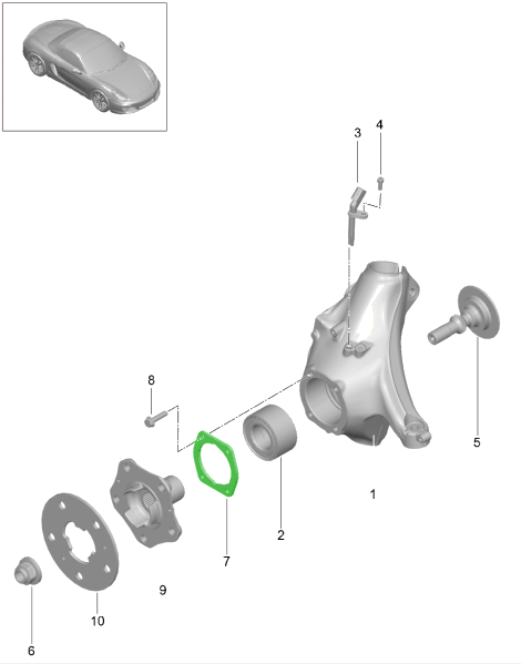 Le moyeu et le porte-roue sont des éléments essentiels de la suspension et du système d'essieu de votre Porsche. Ensemble, ils forment le point de fixation central de la roue, du disque de frein et du roulement, permettant une rotation fluide et un alignement précis. Le porte-roue (ou fusée) est relié aux bras de suspension et à la direction, conservant une géométrie précise pour la stabilité, la sécurité et le contrôle.