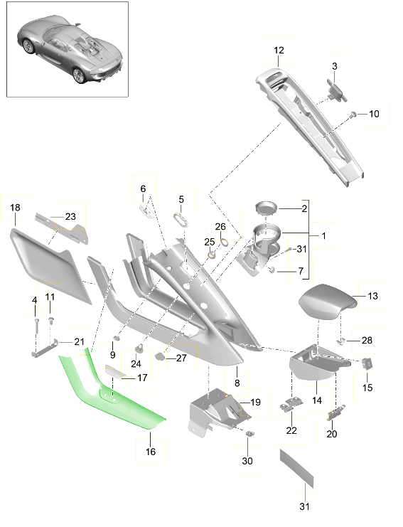 La console centrale est le cœur de l'habitacle de votre Porsche. Elle abrite les commandes essentielles, les rangements, les garnitures et les interfaces électroniques. Des sélecteurs de vitesse et des commutateurs aux accoudoirs et porte-gobelets, ces éléments allient fonctionnalité et harmonie esthétique à l'habitacle.