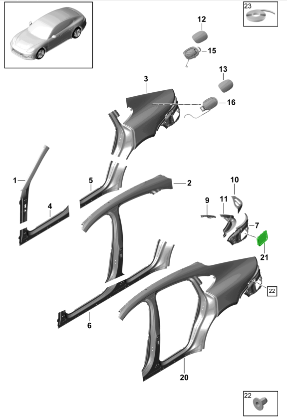 Ailes arrière et panneaux de custode Porsche d'origine et de reproduction, restituant la forme et l'alignement d'origine de la carrosserie. Disponibles en acier, aluminium et matériaux légers.