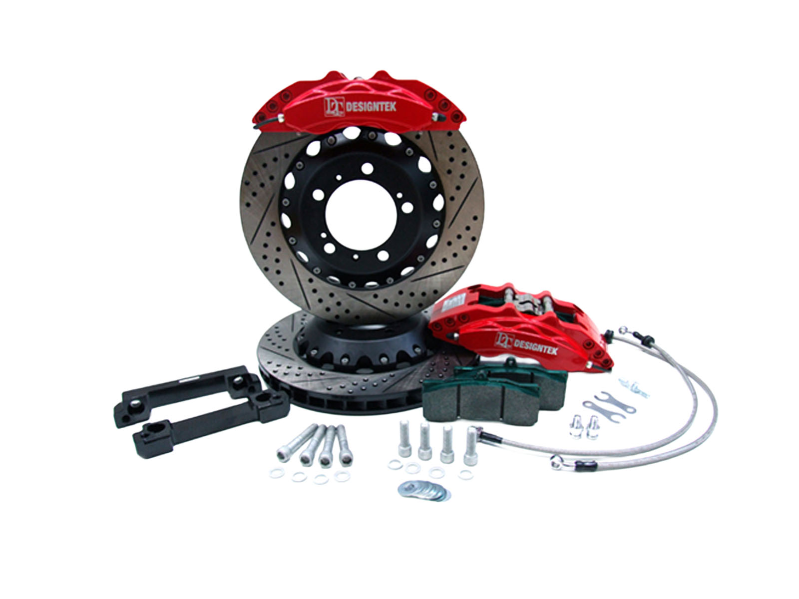 Questo sistema frenante è completo di un set di pastiglie freno ad alte prestazioni, tubi in treccia metallica e piccoli componenti di montaggio di alta qualità.